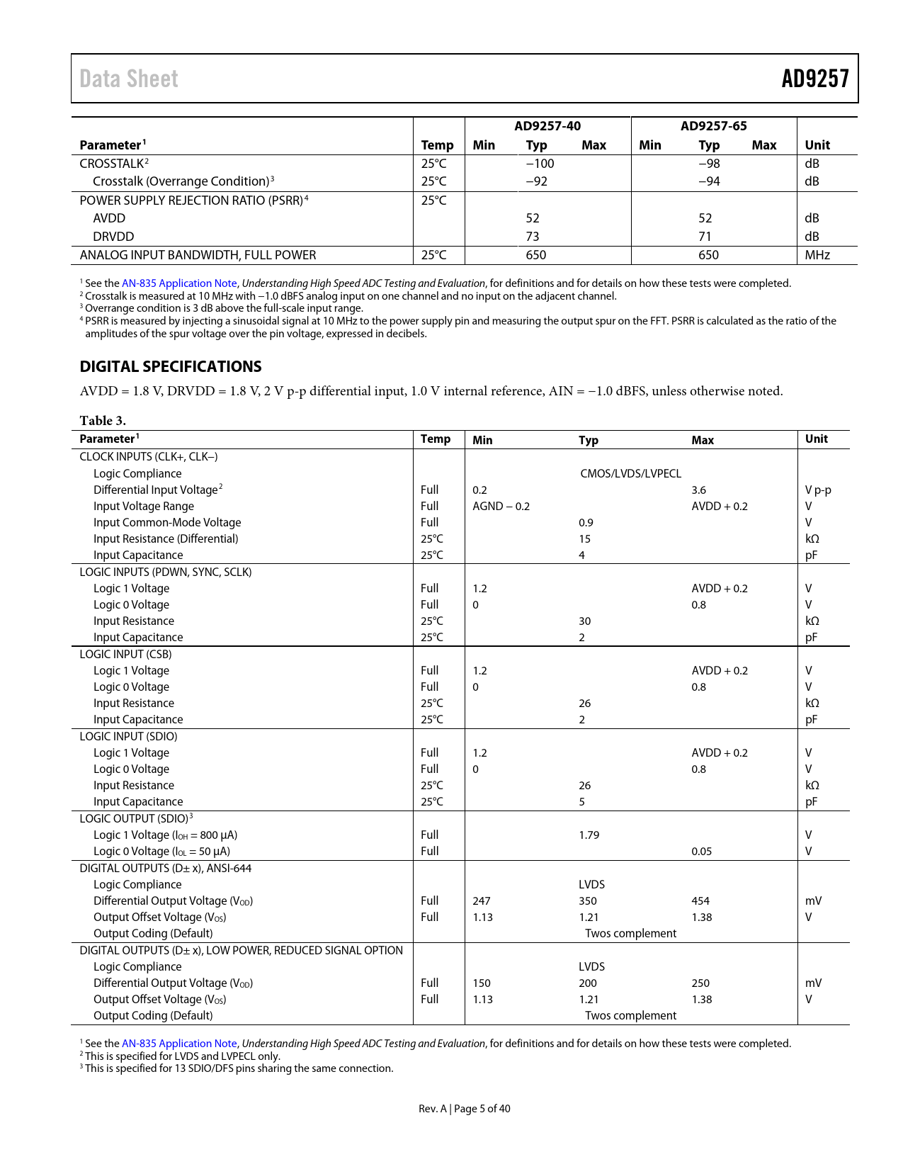 Data Sheet AD9257 AD9257-40 AD9257-65 Parameter1 Temp Min Typ Max Unit DIGITAL SPECIFICATIONS Table 3 Parameter1
