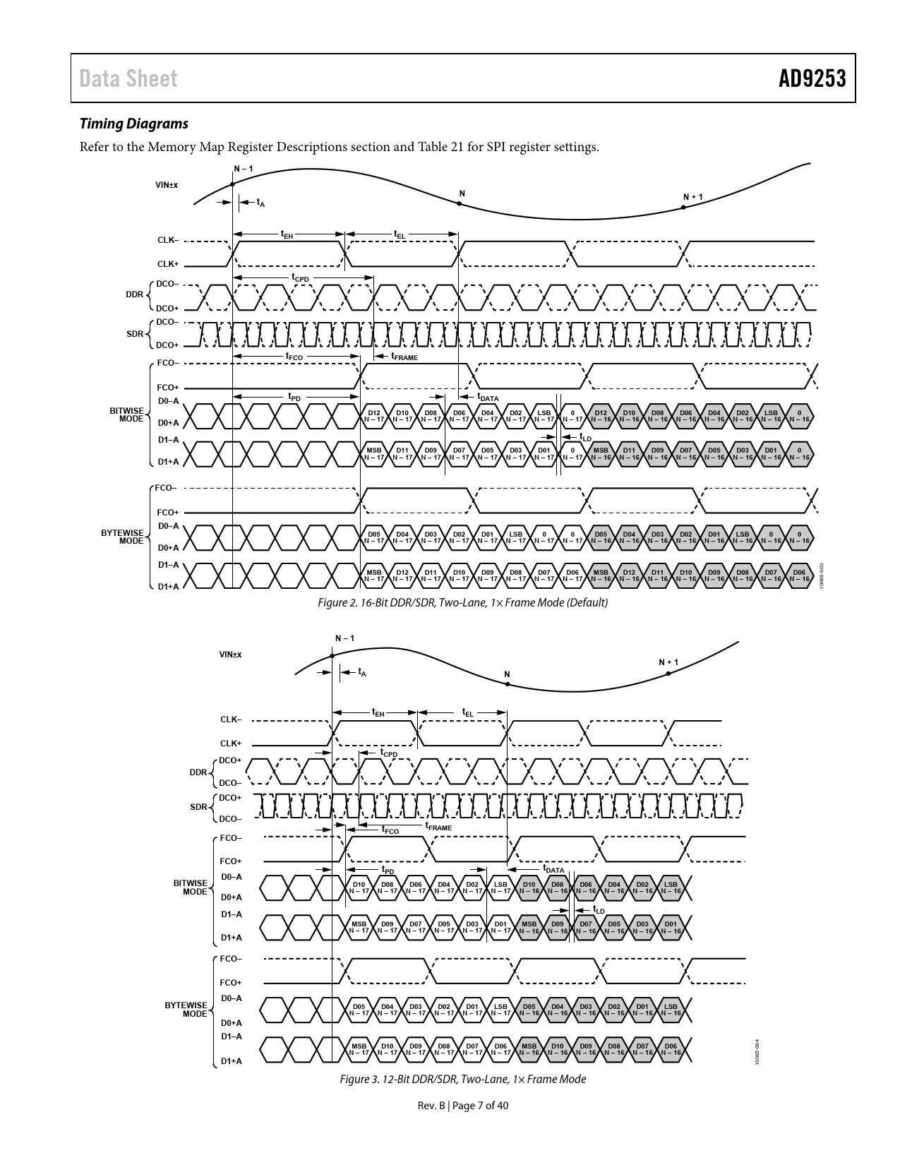 N – 1 VIN±x N + 1 tA N tEH tEL CLK– CLK+ tCPD DCO+ DDR DCO– DCO+ SDR DCO– tFRAME tFCO FCO– FCO+ t t PD DATA D0–A BITWISE D10 D08 D06 D04 D02 LSB D10 D08 D06 D04 D02 LSB MODE N – 17 N – 17 N – 17 N – 17 N – 17 N – 17 N – 16 N – 16 N – 16 N – 16 N – 16 N – 16 D0+A t D1–A LD MSB D09 D07 D05 D03 D01 MSB D09 D07 D05 D03 D01 N – 17 N – 17 N – 17 N – 17 N – 17 N – 17 N – 16 N – 16 N – 16 N – 16 N – 16 N – 16 D1+A FCO– FCO+ D0–A BYTEWISE D05 D04 D03 D02 D01 LSB D05 D04 D03 D02 D01 LSB MODE N – 17 N – 17 N – 17 N – 17 N – 17 N – 17 N – 16 N – 16 N – 16 N – 16 N – 16 N – 16 D0+A D1–A