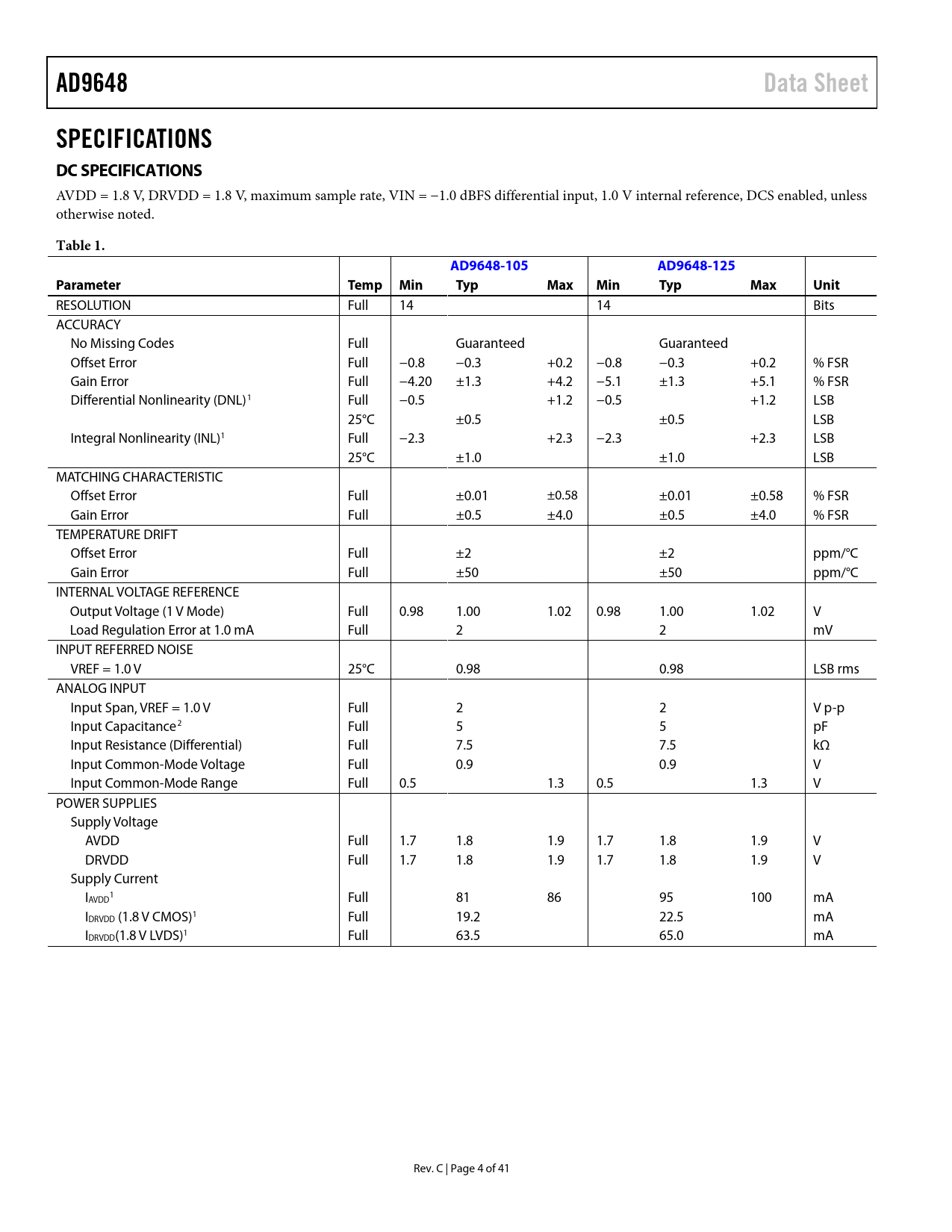 AD9648 Data Sheet SPECIFICATIONS DC SPECIFICATIONS Table 1 AD9648-105 AD9648-125 Parameter Temp Min Typ Max Min Unit
