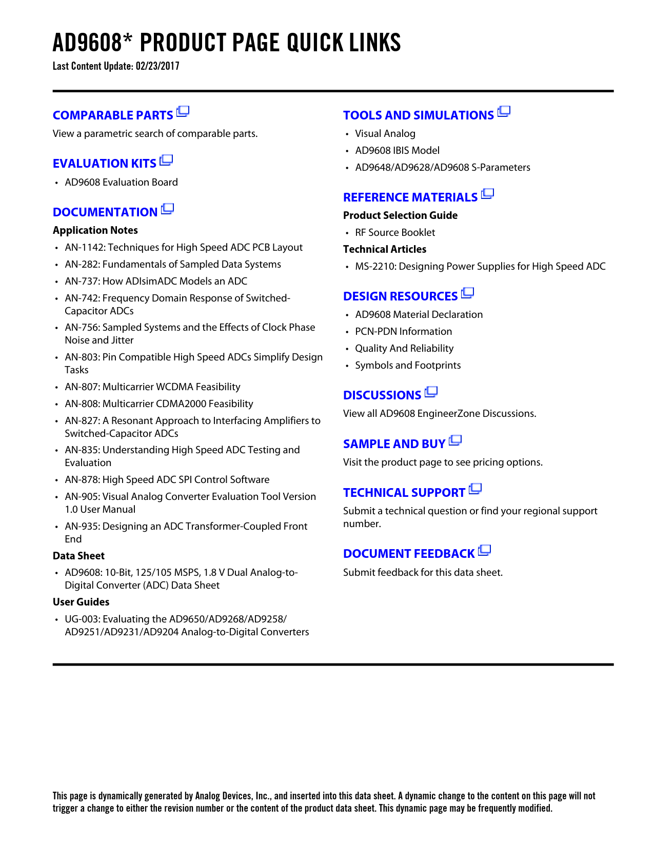 AD9608* PRODUCT PAGE QUICK LINKS Last Content Update: 02/23/2017COMPARABLE PARTSTOOLS AND SIMULATIONS View a parametric search of comparable parts. • Visual Analog • AD9608 IBIS Model EVALUATION KITS • AD9648/AD9628/AD9608 S-Parameters • AD9608 Evaluation Board REFERENCE MATERIALSDOCUMENTATIONProduct Selection GuideApplication Notes • RF Source Booklet • AN-1142: Techniques for High Speed ADC PCB Layout Technical Articles • AN-282: Fundamentals of Sampled Data Systems • MS-2210: Designing Power Supplies for High Speed ADC • AN-737: How ADIsimADC Models an ADC • AN-742: Frequency Domain Response of Switched- DESIGN RESOURCES Capacitor ADCs • AD9608 Material Declaration • AN-756: Sampled Systems and the Effects of Clock Phase • PCN-PDN Information Noise and Jitter • Quality And Reliability • AN-803: Pin Compatible High Speed ADCs Simplify Design Tasks • Symbols and Footprints • AN-807: Multicarrier WCDMA Feasibility DISCUSSIONS • AN-808: Multicarrier CDMA2000 Feasibility View all AD9608 EngineerZone Discussions. • AN-827: A Resonant Approach to Interfacing Amplifiers to Switched-Capacitor ADCs SAMPLE AND BUY • AN-835: Understanding High Speed ADC Testing and Evaluation Visit the product page to see pricing options. • AN-878: High Speed ADC SPI Control Software • AN-905: Visual Analog Converter Evaluation Tool Version TECHNICAL SUPPORT 1.0 User Manual Submit a technical question or find your regional support • AN-935: Designing an ADC Transformer-Coupled Front number. End Data SheetDOCUMENT FEEDBACK • AD9608: 10-Bit, 125/105 MSPS, 1.8 V Dual Analog-to- Submit feedback for this data sheet. Digital Converter (ADC) Data Sheet User Guides • UG-003: Evaluating the AD9650/AD9268/AD9258/ AD9251/AD9231/AD9204 Analog-to-Digital Converters This page is dynamically generated by Analog Devices, Inc., and inserted into this data sheet. A dynamic change to the content on this page will not trigger a change to either the revision number or the content of the product data sheet. This dynamic page may be frequently modified. Document Outline FEATURES APPLICATIONS FUNCTIONAL BLOCK DIAGRAM PRODUCT HIGHLIGHTS TABLE OF CONTENTS REVISION HISTORY GENERAL DESCRIPTION SPECIFICATIONS DC SPECIFICATIONS AC SPECIFICATIONS DIGITAL SPECIFICATIONS SWITCHING SPECIFICATIONS TIMING SPECIFICATIONS Timing Diagrams ABSOLUTE MAXIMUM RATINGS THERMAL CHARACTERISTICS ESD CAUTION PIN CONFIGURATIONS AND FUNCTION DESCRIPTIONS TYPICAL PERFORMANCE CHARACTERISTICS AD9608-125 AD9608-105 EQUIVALENT CIRCUITS THEORY OF OPERATION ADC ARCHITECTURE ANALOG INPUT CONSIDERATIONS Input Common Mode Differential Input Configurations VOLTAGE REFERENCE Internal Reference Connection External Reference Operation CLOCK INPUT CONSIDERATIONS Clock Input Options Input Clock Divider Clock Duty Cycle Jitter Considerations CHANNEL/CHIP SYNCHRONIZATION POWER DISSIPATION AND STANDBY MODE DIGITAL OUTPUTS Digital Output Enable Function (OEB) TIMING Data Clock Output (DCO) OUTPUT TEST OUTPUT TEST MODES SERIAL PORT INTERFACE (SPI) CONFIGURATION USING THE SPI HARDWARE INTERFACE CONFIGURATION WITHOUT THE SPI SPI ACCESSIBLE FEATURES MEMORY MAP READING THE MEMORY MAP REGISTER TABLE Open Locations Default Values Logic Levels Channel-Specific Registers MEMORY MAP REGISTER TABLE MEMORY MAP REGISTER DESCRIPTIONS Power Modes (Register 0x08) Bits[7:6]—Open Bits[4:2]—Open Bits[1:0]—Internal Power-Down Mode Enhancement Control (Register 0x0C) Bits[7:3]—Open Bit 2—Chop Mode Bits[1:0]—Open Output Mode (Register 0x14) Bits[7:6]—Output Port Logic Type Bit 5—Output Interleave Enable Bit 4—Output Port Disable Bit 3—Open Bit 2—Output Invert Bits[1:0]—Output Format Sync Control (Register 0x3A) Bits[7:3]—Open Bit 2—Clock Divider Next Sync Only Bit 1—Clock Divider Sync Enable Bit 0—Open Transfer (Register 0xFF) Sample Rate Override (Register 0x100) User I/O Control 2 (Register 0x101) Bit 7—OEB Pin Enable Bits[6:1]—Open Bit 0—SDIO Pull-Down User I/O Control 3 (Register 0x102) Bits[7:4]—Open Bit 3—VCM Power-Down Bits[2:0]—Open APPLICATIONS INFORMATION DESIGN GUIDELINES Power and Ground Recommendations LVDS Operation Clock Stability Considerations Exposed Paddle Thermal Heat Slug Recommendations VCM Reference Decoupling SPI Port OUTLINE DIMENSIONS ORDERING GUIDE