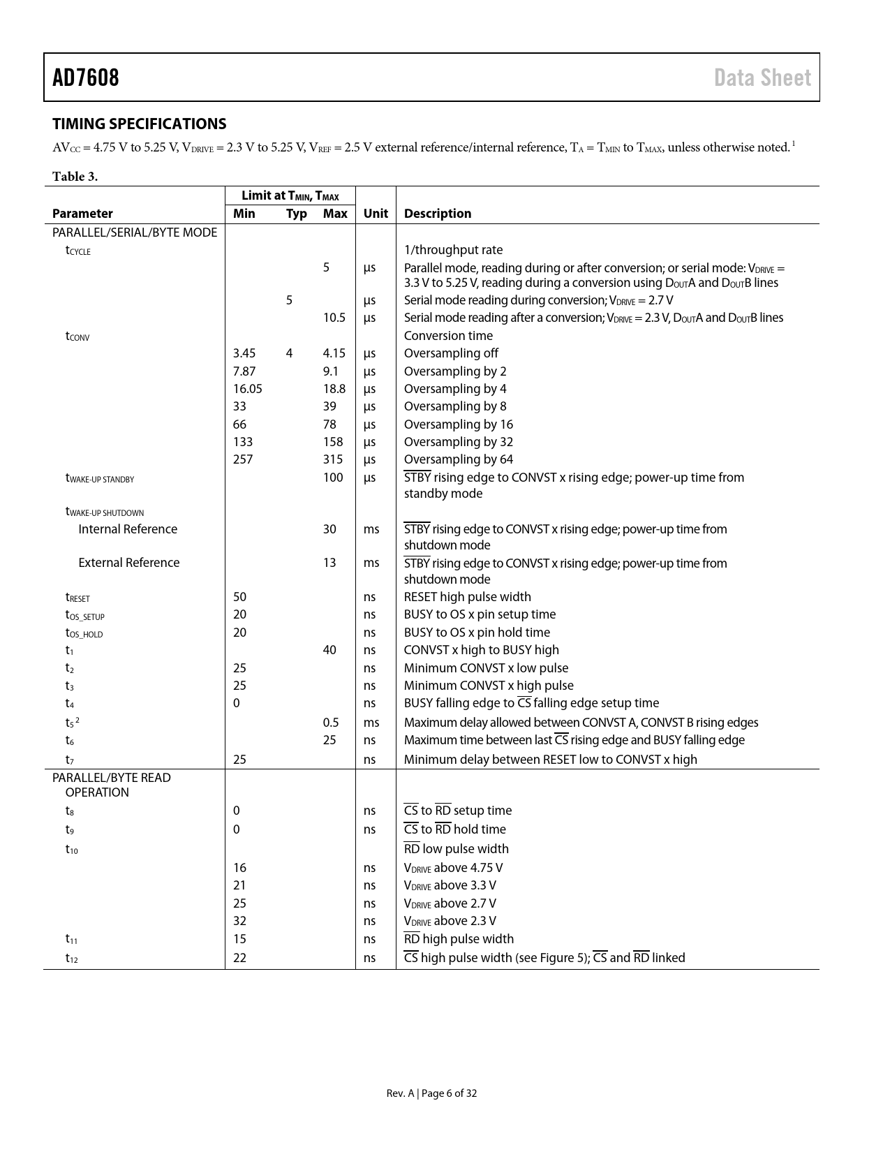 link to page 9 link to page 10 link to page 9 AD7608Data SheetTIMING SPECIFICATIONS AVCC = 4.75 V to 5.25 V, VDRIVE = 2.3 V to 5.25 V, VREF = 2.5 V external reference/internal reference, TA = TMIN to TMAX, unless otherwise noted.1 Table 3.Limit at TMIN, TMAXParameterMinTypMaxUnitDescription PARALLEL/SERIAL/BYTE MODE tCYCLE 1/throughput rate 5 µs Parallel mode, reading during or after conversion; or serial mode: VDRIVE = 3.3 V to 5.25 V, reading during a conversion using DOUTA and DOUTB lines 5 µs Serial mode reading during conversion; VDRIVE = 2.7 V 10.5 µs Serial mode reading after a conversion; VDRIVE = 2.3 V, DOUTA and DOUTB lines tCONV Conversion time 3.45 4 4.15 µs Oversampling off 7.87 9.1 µs Oversampling by 2 16.05 18.8 µs Oversampling by 4 33 39 µs Oversampling by 8 66 78 µs Oversampling by 16 133 158 µs Oversampling by 32 257 315 µs Oversampling by 64 tWAKE-UP STANDBY 100 µs E ST BY rising edge to CONVST x rising edge; power-up time from A standby mode tWAKE-UP SHUTDOWN Internal Reference 30 ms STBYE rising edge to CONVST x rising edge; power-up time from A A shutdown mode External Reference 13 ms STBYE rising edge to CONVST x rising edge; power-up time from A A shutdown mode tRESET 50 ns RESET high pulse width tOS_SETUP 20 ns BUSY to OS x pin setup time tOS_HOLD 20 ns BUSY to OS x pin hold time t1 40 ns CONVST x high to BUSY high t2 25 ns Minimum CONVST x low pulse t3 25 ns Minimum CONVST x high pulse t4 0 ns BUSY falling edge to CSE falling edge setup time A A t 2 5 0.5 ms Maximum delay al owed between CONVST A, CONVST B rising edges 10F9F t6 25 ns Maximum time between last CSE rising edge and BUSY fal ing edge A A t7 25 ns Minimum delay between RESET low to CONVST x high PARALLEL/BYTE READ OPERATION t8 0 ns CSE to RDE setup time A A A A t9 0 ns CSE to RDE hold time A A A A t10 RDE low pulse width A A 16 ns VDRIVE above 4.75 V 21 ns VDRIVE above 3.3 V 25 ns VDRIVE above 2.7 V 32 ns VDRIVE above 2.3 V t11 15 ns RDE high pulse width A A t12 22 ns CSE high pulse width (see Figure 5); CSE and RDE linked A A A A A A Rev. A | Page 6 of 32 Document Outline Features Applications Companion Products Functional Block Diagram Table of Contents Revision History General Description Specifications Timing Specifications Timing Diagrams Absolute Maximum Ratings Thermal Resistance ESD Caution Pin Configuration and Function Descriptions Typical Performance Characteristics Terminology Theory of Operation Converter Details Analog Input Analog Input Ranges Analog Input Impedance Analog Input Clamp Protection Analog Input Antialiasing Filter Track-and-Hold Amplifiers ADC Transfer Function Internal/External Reference External Reference Mode Internal Reference Mode Typical Connection Diagram Power-Down Modes Conversion Control Simultaneous Sampling on All Analog Input Channels Simultaneously Sampling Two Sets of Channels Digital Interface Parallel Interface (/SER SEL = 0) Serial Interface (/SER SEL = 1) Reading During Conversion Digital Filter Layout Guidelines Outline Dimensions Ordering Guide