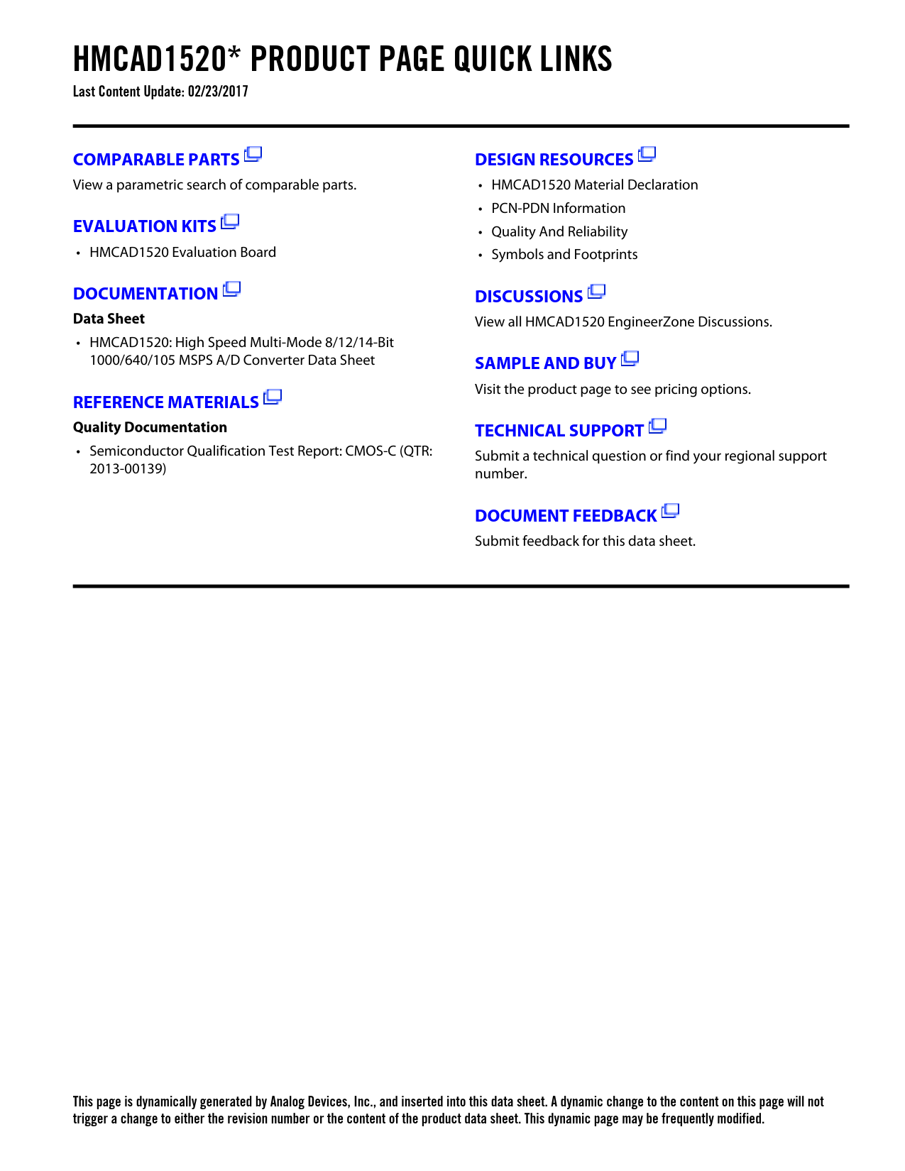 HMCAD1520* PRODUCT PAGE QUICK LINKS Last Content Update: 02/23/2017 COMPARABLE PARTS DESIGN RESOURCES EVALUATION KITS