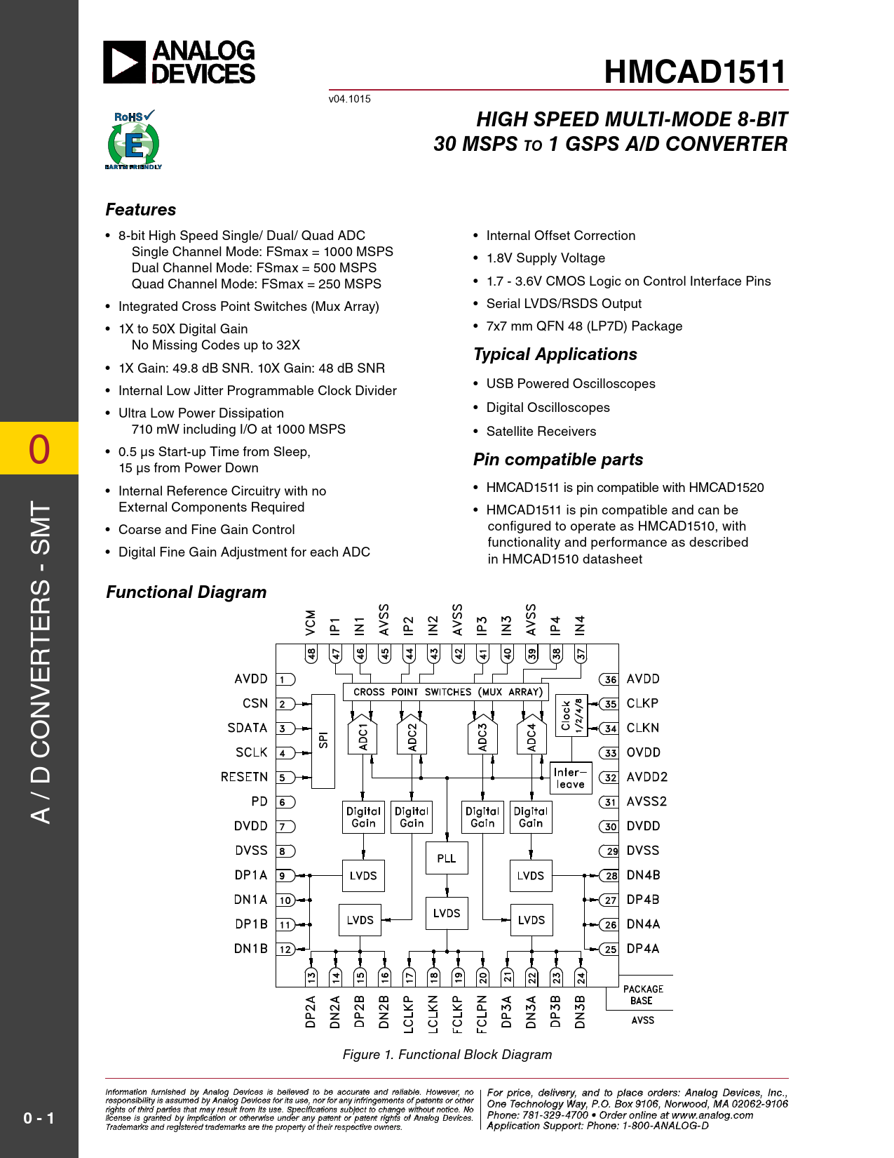 HMCAD1511. HigH Speed Multi-Mode 8-Bit. 30 MSpS to 1 gSpS A/d Converter. Features. typical Applications. pin compatible parts