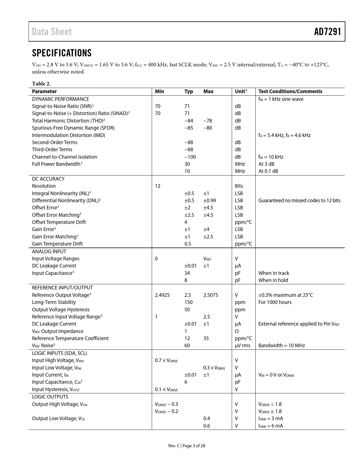 Data Sheet AD7291 SPECIFICATIONS Table 2 Parameter Min Typ Max Unit1 Test Conditions/Comments