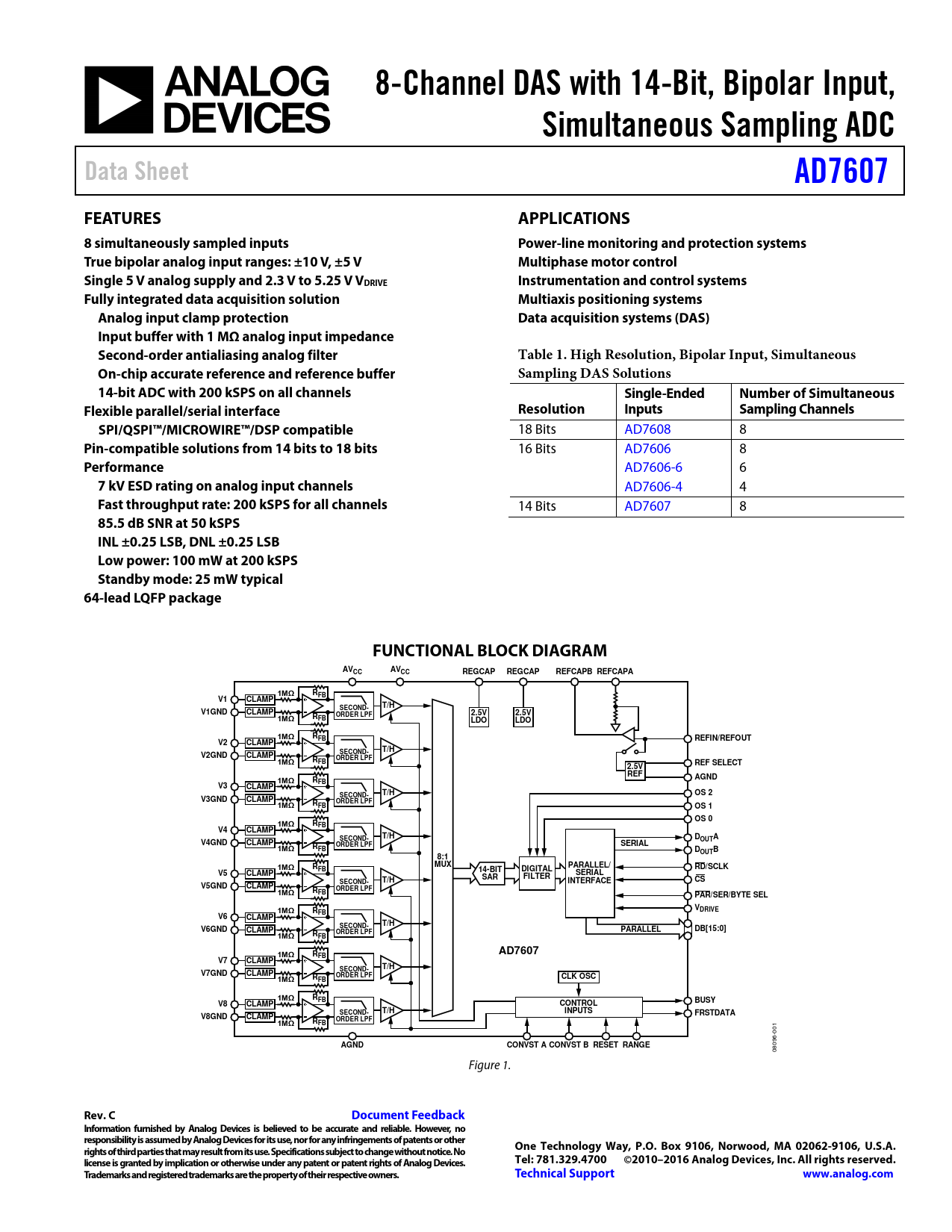 8-Channel DAS with 14-Bit, Bipolar Input,. Simultaneous Sampling ADC. Data Sheet. AD7607. FEATURES. APPLICATIONS