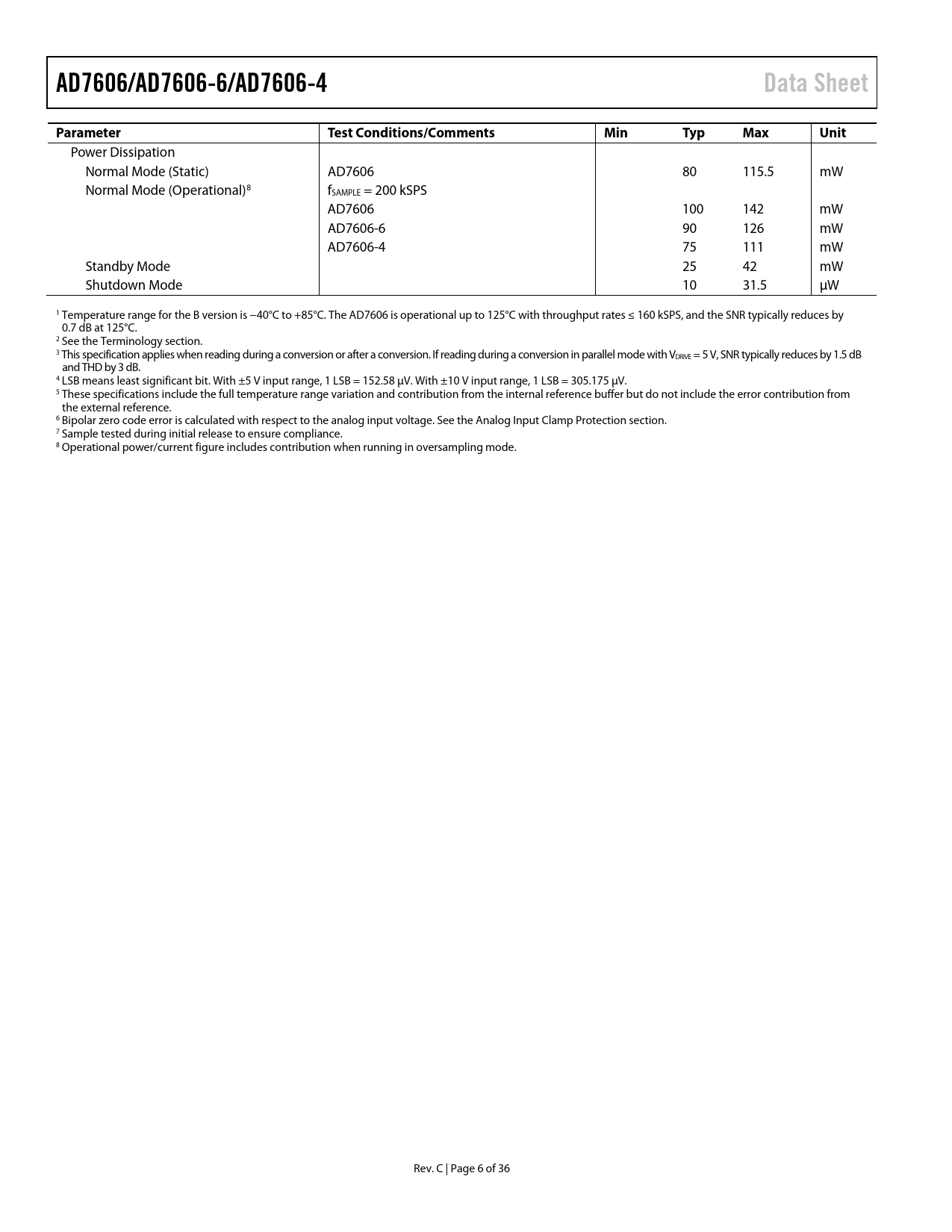Power Dissipation Normal Mode (Static) AD7606 80 115.5 mW Normal Mode (Operational)8 fSAMPLE = 200 kSPS AD7606 100 142 mW AD7606-6 90 126 mW AD7606-4 75 111 mW Standby Mode 25 42 mW Shutdown Mode 10 31.5 µW 1 Temperature range for the B version is −40°C to +85°C. The AD7606 is operational up to 125°C with throughput rates ≤ 160 kSPS, and the SNR typically reduces by 0.7 dB at 125°C. 2 See the Terminology section. 3 This specification applies when reading during a conversion or after a conversion. If reading during a conversion in paral el mode with VDRIVE = 5 V, SNR typically reduces by 1.5 dB and THD by 3 dB. 4 LSB means least significant bit. With ±5 V input range, 1 LSB = 152.58 µV. With ±10 V input range, 1 LSB = 305.175 µV. 5 These specifications include the full temperature range variation and contribution from the internal reference buffer but do not include the error contribution from the external reference. 6 Bipolar zero code error is calculated with respect to the analog input voltage. See the Analog Input Clamp Protection section. 7 Sample tested during initial release to ensure compliance. 8 Operational power/current figure includes contribution when running in oversampling mode. Rev. C | Page 6 of 36 Document Outline Features Applications Functional Block Diagram Revision History General Description Specifications Timing Specifications Timing Diagrams Absolute Maximum Ratings Thermal Resistance ESD Caution Pin Configurations and Function Descriptions Typical Performance Characteristics Terminology Theory of Operation Converter Details Analog Input Analog Input Ranges Analog Input Impedance Analog Input Clamp Protection Analog Input Antialiasing Filter Track-and-Hold Amplifiers ADC Transfer Function Internal/External Reference Typical Connection Diagram Power-Down Modes Conversion Control Simultaneous Sampling on All Analog Input Channels Simultaneously Sampling Two Sets of Channels Digital Interface Parallel Interface (PAR/SER/BYTE SEL = 0) Parallel Byte (PAR/SER/BYTE SEL = 1, DB15 = 1) Serial Interface (PAR/SER/BYTE SEL = 1) Reading During Conversion Digital Filter Layout Guidelines Outline Dimensions Ordering Guide
