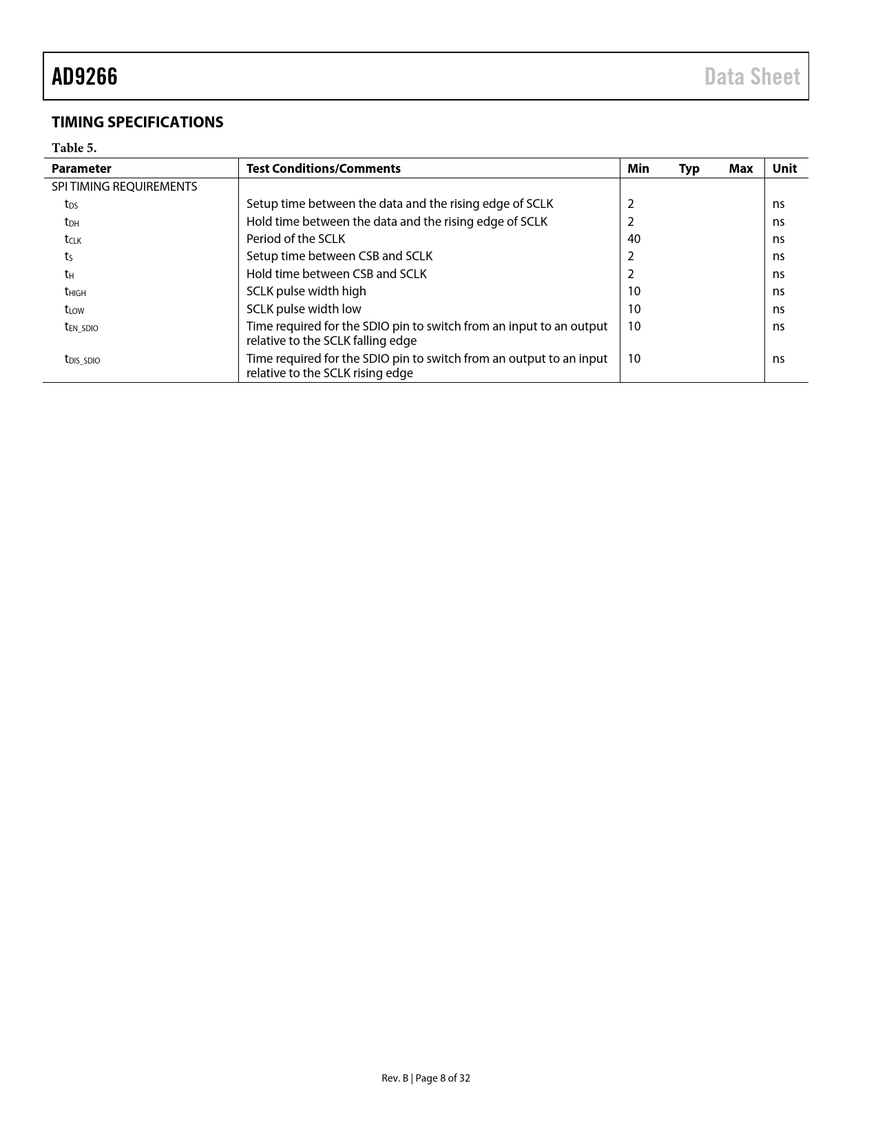 AD9266 Data Sheet TIMING SPECIFICATIONS Table 5. Parameter Test Conditions/Comments Min Typ Max Unit