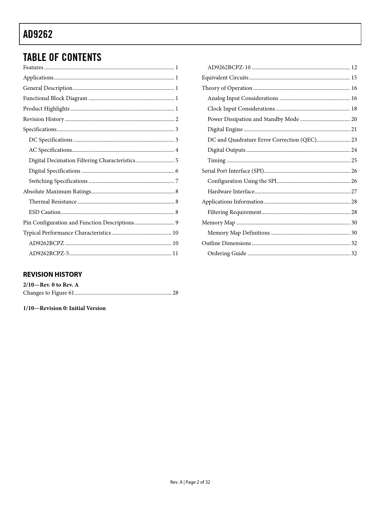 link to page 1 link to page 1 link to page 1 link to page 1 link to page 1 link to page 3 link to page 4 link to page 4 link to page 5 link to page 6 link to page 7 link to page 8 link to page 9 link to page 9 link to page 9 link to page 10 link to page 11 link to page 11 link to page 12 link to page 13 link to page 16 link to page 17 link to page 17 link to page 19 link to page 21 link to page 22 link to page 24 link to page 25 link to page 26 link to page 27 link to page 27 link to page 28 link to page 29 link to page 29 link to page 31 link to page 31 link to page 33 link to page 33 AD9262TABLE OF CONTENTS Features .. 1 AD9262BCPZ-10 ... 12 Applications ... 1 Equivalent Circuits ... 15 General Description ... 1 Theory of Operation .. 16 Functional Block Diagram .. 1 Analog Input Considerations ... 16 Product Highlights ... 1 Clock Input Considerations .. 18 Revision History ... 2 Power Dissipation and Standby Mode .. 20 Specifications ... 3 Digital Engine ... 21 DC Specifications ... 3 DC and Quadrature Error Correction (QEC) .. 23 AC Specifications .. 4 Digital Outputs ... 24 Digital Decimation Filtering Characteristics .. 5 Timing ... 25 Digital Specifications ... 6 Serial Port Interface (SPI) .. 26 Switching Specifications .. 7 Configuration Using the SPI ... 26 Absolute Maximum Ratings .. 8 Hardware Interface ... 27 Thermal Resistance .. 8 Applications Information .. 28 ESD Caution .. 8 Filtering Requirement .. 28 Pin Configuration and Function Descriptions ... 9 Memory Map .. 30 Typical Performance Characteristics ... 10 Memory Map Definitions ... 30 AD9262BCPZ ... 10 Outline Dimensions ... 32 AD9262BCPZ-5 .. 11 Ordering Guide .. 32 REVISION HISTORY2/10—Rev. 0 to Rev. A Changes to Figure 61 .. 28 1/10—Revision 0: Initial Version Rev. A | Page 2 of 32 Document Outline Features Applications General Description Functional Block Diagram Product Highlights Revision History Specifications DC Specifications AC Specifications Digital Decimation Filtering Characteristics Digital Specifications Switching Specifications Timing Diagram Absolute Maximum Ratings Thermal Resistance ESD Caution Pin Configuration and Function Descriptions Typical Performance Characteristics AD9262BCPZ AD9262BCPZ-5 AD9262BCPZ-10 Equivalent Circuits Theory of Operation Analog Input Considerations Input Common Mode Differential Input Configurations Voltage Reference Internal Reference Connection External Reference Operation Clock Input Considerations Direct Clocking Internal PLL Clock Distribution PLL Autoband Select Jitter Considerations Power Dissipation and Standby Mode Digital Engine Bandwidth Selection Decimation Filters Sample Rate Converter Cascaded Filter Responses DC and Quadrature Error Correction (QEC) LO Leakage (DC) Correction QEC and DC Correction Range Digital Outputs Digital Output Format Interleaved Outputs Overrange (OR) Condition Timing Serial Port Interface (SPI) Configuration Using the SPI Hardware Interface Applications Information Filtering Requirement Memory Map Memory Map Definitions Outline Dimensions Ordering Guide