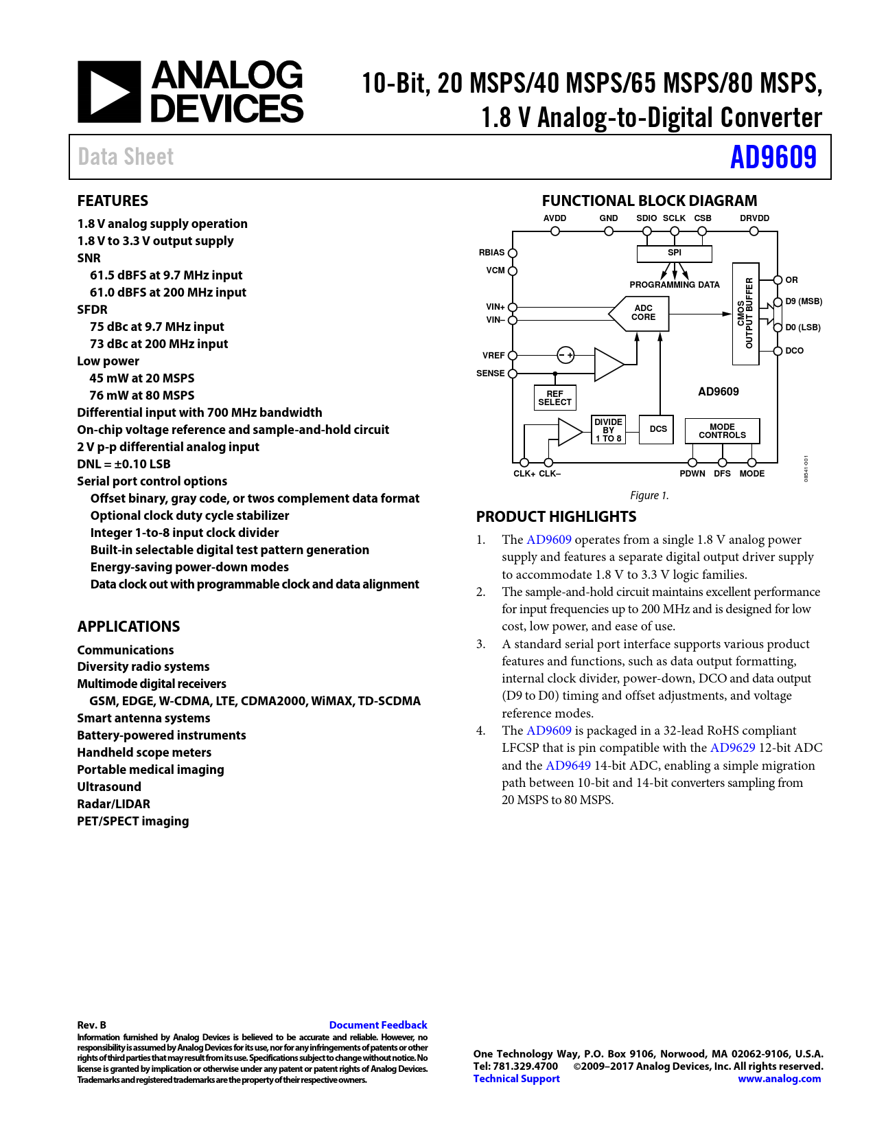 10-Bit, 20 MSPS/40 MSPS/65 MSPS/80 MSPS,. 1.8 V Analog-to-Digital Converter. Data Sheet. AD9609. FEATURES