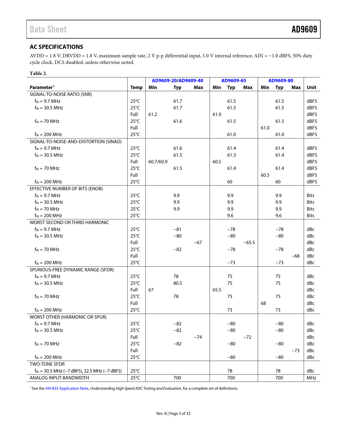 Data Sheet. AD9609. AC SPECIFICATIONS. Table 2. AD9609-20/AD9609-40. AD9609-65. AD9609-80. Parameter1. Temp Min. Typ. Max. Min Typ. Max Unit