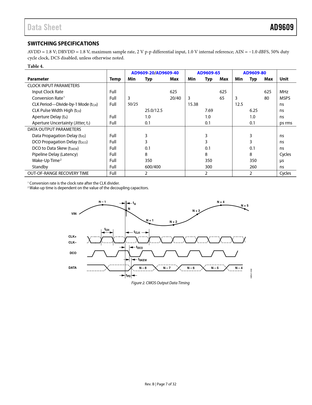 Data Sheet. AD9609. SWITCHING SPECIFICATIONS. Table 4. AD9609-20/AD9609-40. AD9609-65. AD9609-80. Parameter. Temp. Min. Typ. Max. Unit. N – 1