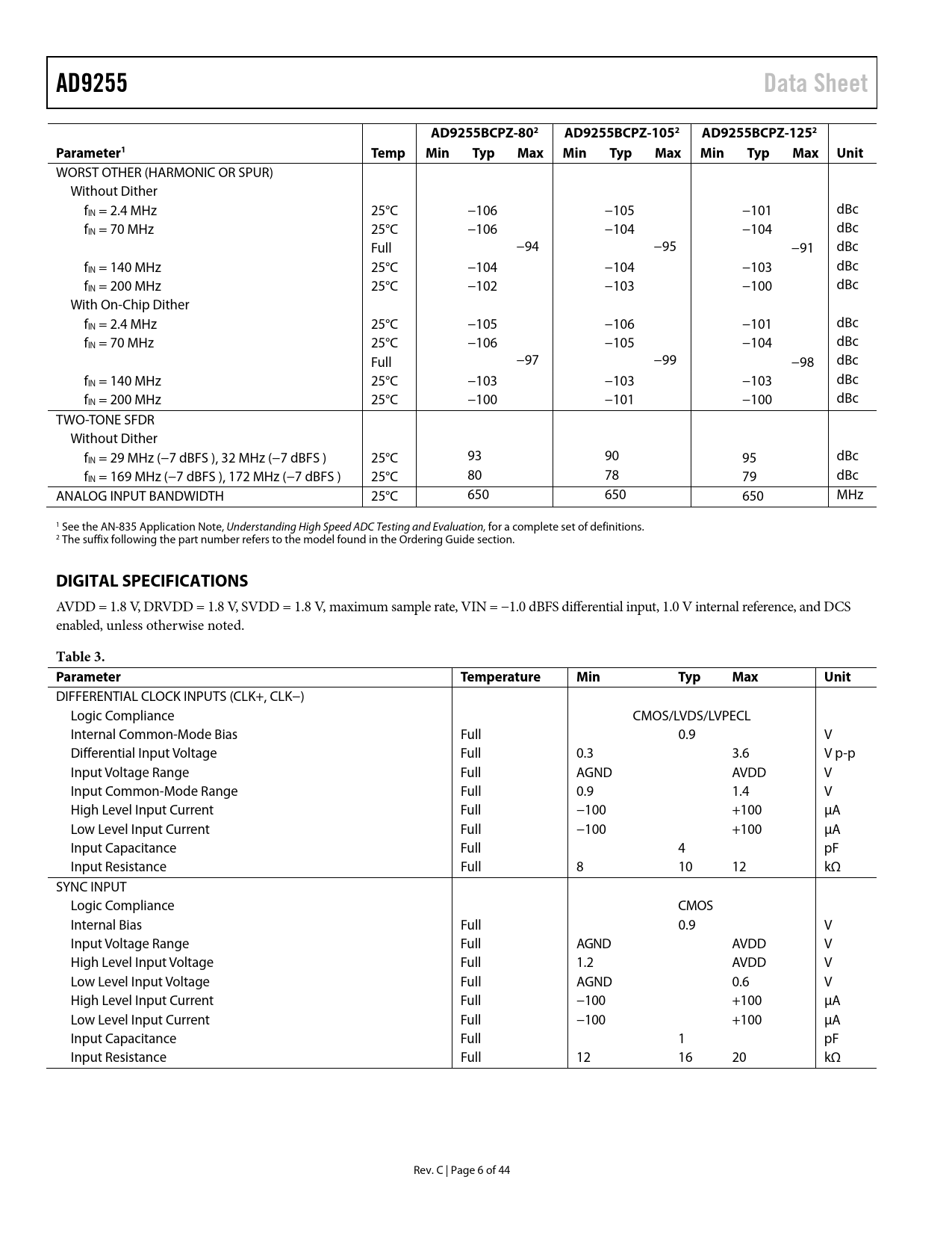 WORST OTHER (HARMONIC OR SPUR) Without Dither fIN = 2.4 MHz 25°C −106 −105 −101 dBc fIN = 70 MHz 25°C −106 −104 −104 dBc Full −94 −95 −91 dBc fIN = 140 MHz 25°C −104 −104 −103 dBc fIN = 200 MHz 25°C −102 −103 −100 dBc With On-Chip Dither fIN = 2.4 MHz 25°C −105 −106 −101 dBc fIN = 70 MHz 25°C −106 −105 −104 dBc Full −97 −99 −98 dBc fIN = 140 MHz 25°C −103 −103 −103 dBc fIN = 200 MHz 25°C −100 −101 −100 dBc TWO-TONE SFDR Without Dither fIN = 29 MHz (−7 dBFS ), 32 MHz (−7 dBFS ) 25°C 93 90 95 dBc fIN = 169 MHz (−7 dBFS ), 172 MHz (−7 dBFS ) 25°C 80 78 79 dBc ANALOG INPUT BANDWIDTH 25°C 650 650 650 MHz 1 See the AN-835 Application Note, Understanding High Speed ADC Testing and Evaluation, for a complete set of definitions. 2 The suffix following the part number refers to the model found in the Ordering Guide section.