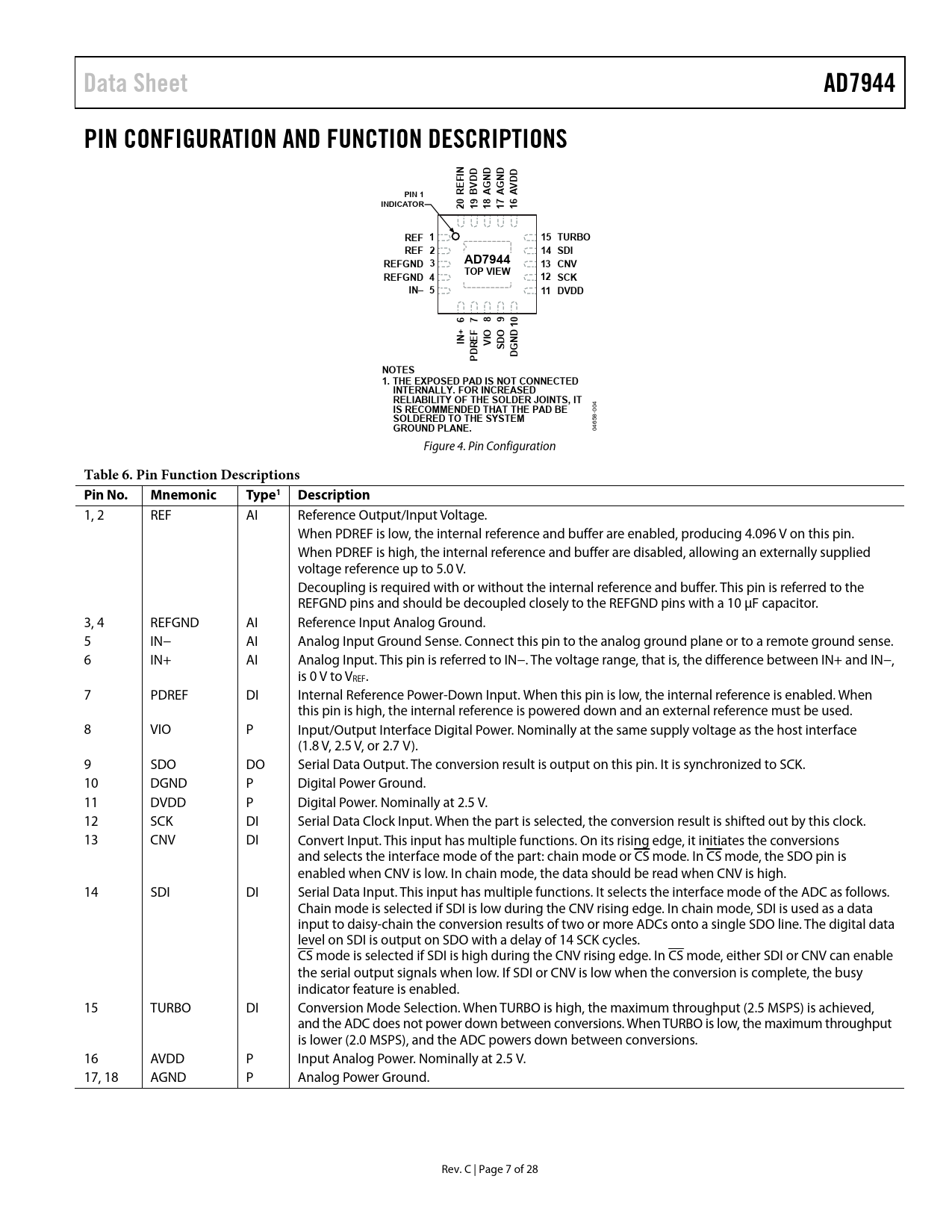 Data Sheet AD7944 PIN CONFIGURATION AND FUNCTION DESCRIPTIONS PIN 1 INDICATOR 81 71 61 REF 1 15 TURBO REF 2 14 SDI REFGND 3 13 CNV