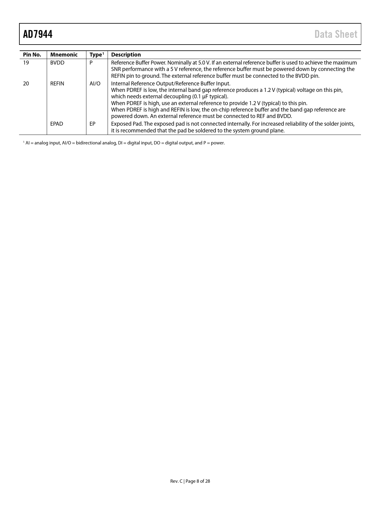 AD7944. Data Sheet. Pin No. Mnemonic. Type1 Description