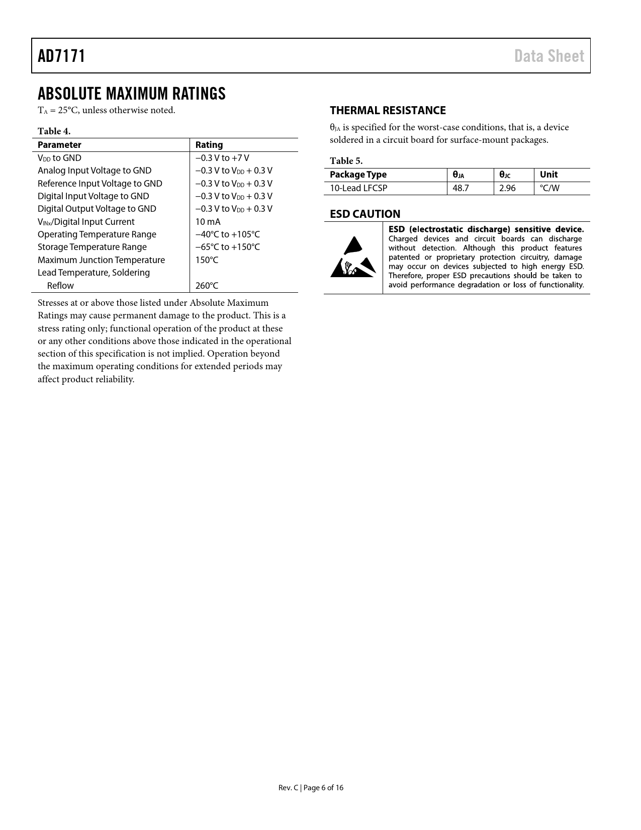 AD7171Data SheetABSOLUTE MAXIMUM RATINGS TA = 25°C, unless otherwise noted. THERMAL RESISTANCETable 4. θJA is specified for the worst-case conditions, that is, a device ParameterRating soldered in a circuit board for surface-mount packages. VDD to GND −0.3 V to +7 V Table 5. Analog Input Voltage to GND −0.3 V to VDD + 0.3 V Package TypeθJAθJCUnit Reference Input Voltage to GND −0.3 V to VDD + 0.3 V 10-Lead LFCSP 48.7 2.96 °C/W Digital Input Voltage to GND −0.3 V to VDD + 0.3 V Digital Output Voltage to GND −0.3 V to VDD + 0.3 V ESD CAUTION VINx/Digital Input Current 10 mA Operating Temperature Range −40°C to +105°C Storage Temperature Range −65°C to +150°C Maximum Junction Temperature 150°C Lead Temperature, Soldering Reflow 260°C Stresses at or above those listed under Absolute Maximum Ratings may cause permanent damage to the product. This is a stress rating only; functional operation of the product at these or any other conditions above those indicated in the operational section of this specification is not implied. Operation beyond the maximum operating conditions for extended periods may affect product reliability. Rev. C | Page 6 of 16 Document Outline FEATURES INTERFACE APPLICATIONS FUNCTIONAL BLOCK DIAGRAM GENERAL DESCRIPTION TABLE OF CONTENTS REVISION HISTORY SPECIFICATIONS TIMING CHARACTERISTICS Timing Diagrams ABSOLUTE MAXIMUM RATINGS THERMAL RESISTANCE ESD CAUTION PIN CONFIGURATION AND FUNCTION DESCRIPTIONS TYPICAL PERFORMANCE CHARACTERISTICS OUTPUT NOISE AND RESOLUTION SPECIFICATIONS ADC CIRCUIT INFORMATION OVERVIEW FILTER, DATA RATE, AND SETTLING TIME GAIN POWER-DOWN/RESET (PDRST\) ANALOG INPUT CHANNEL BIPOLAR CONFIGURATION DATA OUTPUT CODING REFERENCE DIGITAL INTERFACE GROUNDING AND LAYOUT APPLICATIONS INFORMATION TEMPERATURE SYSTEM SIGNAL CONDITIONING CIRCUIT OUTLINE DIMENSIONS ORDERING GUIDE