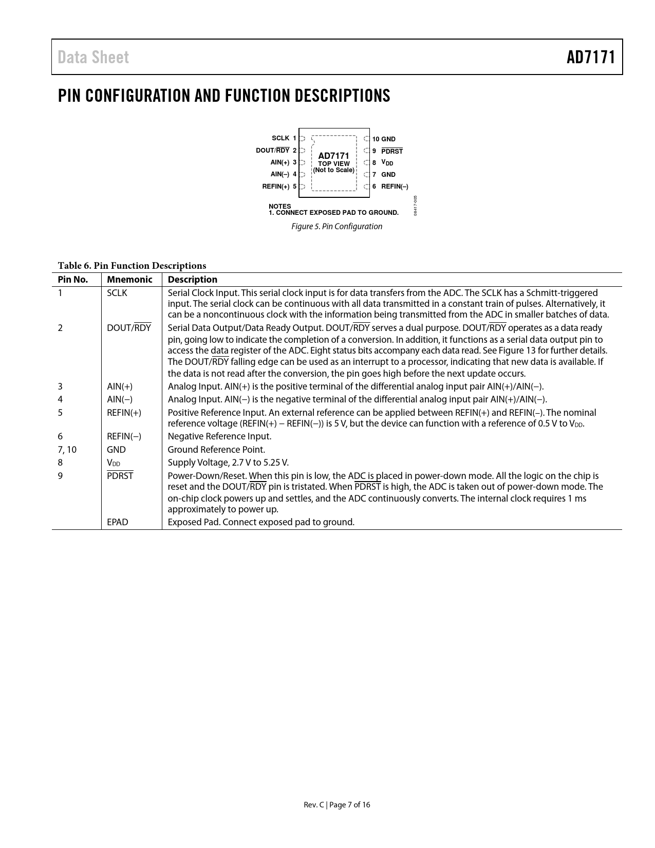 Data Sheet AD7171 PIN CONFIGURATION AND FUNCTION DESCRIPTIONS SCLK 1 10 GND DOUT/RDY 2 9 PDRST AIN(+) 3 8 V TOP VIEW