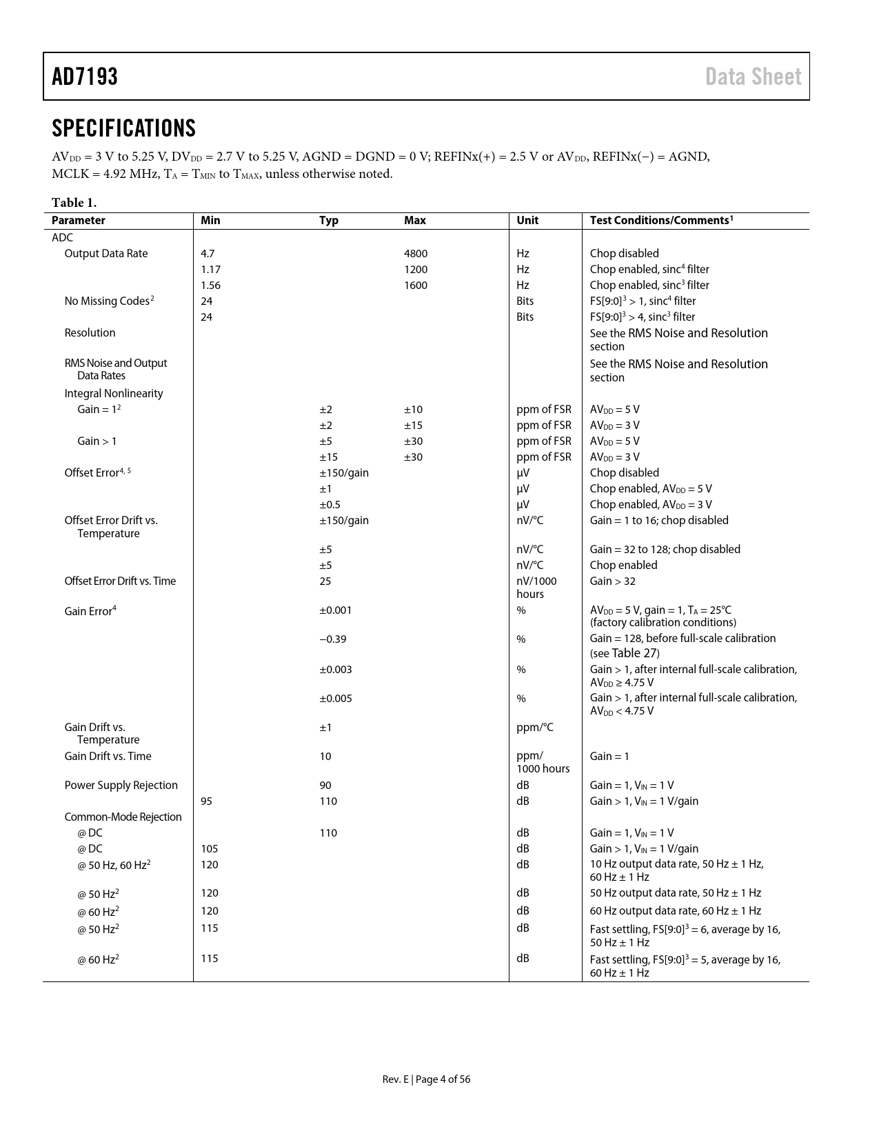 Páginas / Página57 / 5 — AD7193. Data Sheet. SPECIFICATIONS. Table 1. Parameter. Min. Typ. Max. …