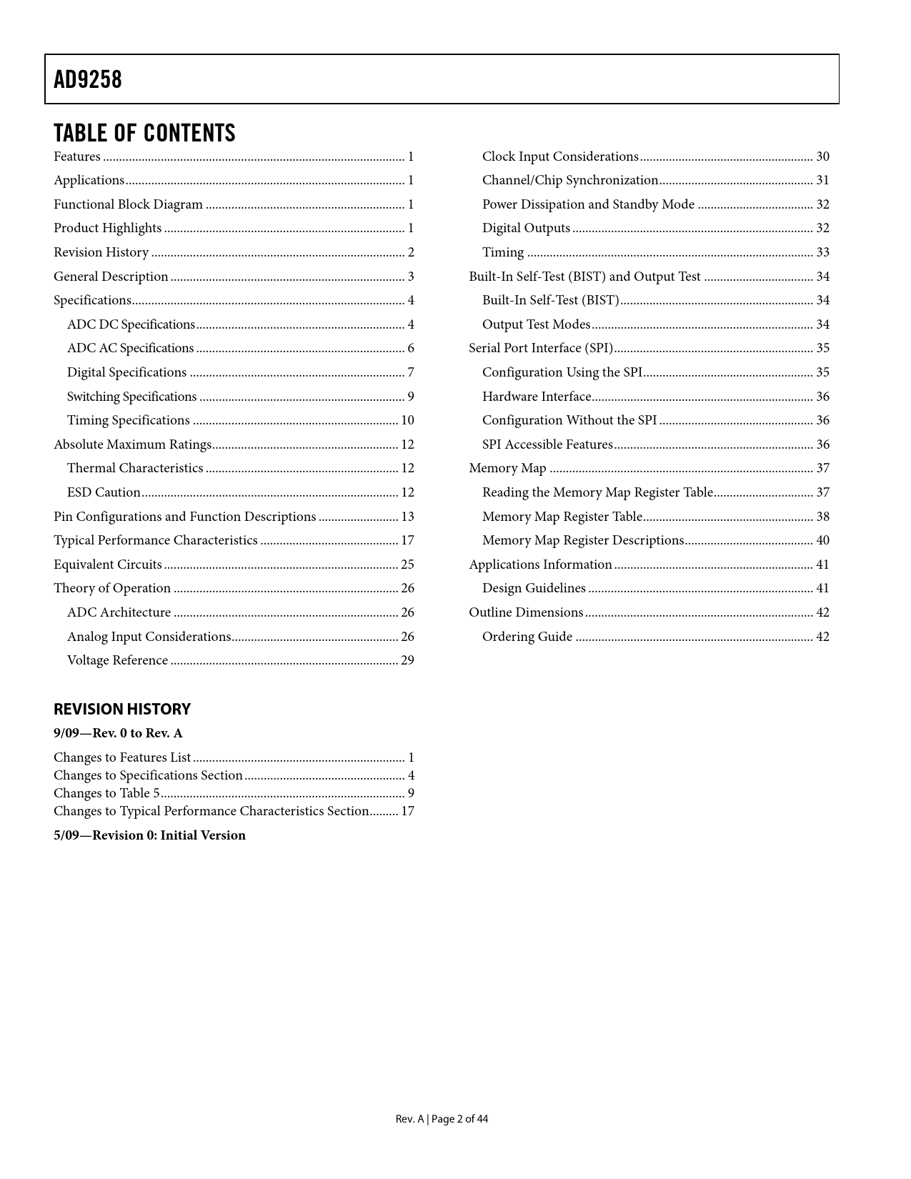 link to page 1 link to page 1 link to page 4 link to page 5 link to page 5 link to page 7 link to page 10 link to page 11 link to page 13 link to page 13 link to page 14 link to page 18 link to page 26 link to page 27 link to page 33 link to page 34 link to page 35 link to page 35 link to page 35 link to page 36 link to page 36 link to page 37 link to page 38 link to page 38 link to page 39 link to page 41 link to page 42 link to page 42 link to page 43 link to page 43 link to page 1 link to page 1 link to page 3 link to page 8 link to page 13 link to page 27 link to page 27 link to page 30 link to page 31 link to page 32 link to page 33 link to page 37 link to page 37 AD9258TABLE OF CONTENTS Features .. 1 Clock Input Considerations .. 30 Applications ... 1 Channel/Chip Synchronization .. 31 Functional Block Diagram .. 1 Power Dissipation and Standby Mode .. 32 Product Highlights ... 1 Digital Outputs ... 32 Revision History ... 2 Timing ... 33 General Description ... 3 Built-In Self-Test (BIST) and Output Test .. 34 Specifications ... 4 Built-In Self-Test (BIST) .. 34 ADC DC Specifications ... 4 Output Test Modes ... 34 ADC AC Specifications ... 6 Serial Port Interface (SPI) .. 35 Digital Specifications ... 7 Configuration Using the SPI ... 35 Switching Specifications .. 9 Hardware Interface ... 36 Timing Specifications .. 10 Configuration Without the SPI .. 36 Absolute Maximum Ratings .. 12 SPI Accessible Features .. 36 Thermal Characteristics .. 12 Memory Map .. 37 ESD Caution .. 12 Reading the Memory Map Register Table ... 37 Pin Configurations and Function Descriptions ... 13 Memory Map Register Table ... 38 Typical Performance Characteristics ... 17 Memory Map Register Descriptions .. 40 Equivalent Circuits ... 25 Applications Information .. 41 Theory of Operation .. 26 Design Guidelines .. 41 ADC Architecture .. 26 Outline Dimensions ... 42 Analog Input Considerations .. 26 Ordering Guide .. 42 Voltage Reference ... 29 REVISION HISTORY9/09—Rev. 0 to Rev. A Changes to Features List .. 1 Changes to Specifications Section .. 4 Changes to Table 5 .. 9 Changes to Typical Performance Characteristics Section ... 17 5/09—Revision 0: Initial Version Rev. A | Page 2 of 44 Document Outline FEATURES APPLICATIONS FUNCTIONAL BLOCK DIAGRAM PRODUCT HIGHLIGHTS TABLE OF CONTENTS REVISION HISTORY GENERAL DESCRIPTION SPECIFICATIONS ADC DC SPECIFICATIONS ADC AC SPECIFICATIONS DIGITAL SPECIFICATIONS SWITCHING SPECIFICATIONS TIMING SPECIFICATIONS Timing Diagrams ABSOLUTE MAXIMUM RATINGS THERMAL CHARACTERISTICS ESD CAUTION PIN CONFIGURATIONS AND FUNCTION DESCRIPTIONS TYPICAL PERFORMANCE CHARACTERISTICS EQUIVALENT CIRCUITS THEORY OF OPERATION ADC ARCHITECTURE ANALOG INPUT CONSIDERATIONS Input Common Mode Common-Mode Voltage Servo Dither Large-Signal FFT Small-Signal FFT Static Linearity Differential Input Configurations VOLTAGE REFERENCE Internal Reference Connection External Reference Operation CLOCK INPUT CONSIDERATIONS Clock Input Options Input Clock Divider Clock Duty Cycle Jitter Considerations CHANNEL/CHIP SYNCHRONIZATION POWER DISSIPATION AND STANDBY MODE DIGITAL OUTPUTS Digital Output Enable Function (OEB) TIMING Data Clock Output (DCO) BUILT-IN SELF-TEST (BIST) AND OUTPUT TEST BUILT-IN SELF-TEST (BIST) OUTPUT TEST MODES SERIAL PORT INTERFACE (SPI) CONFIGURATION USING THE SPI HARDWARE INTERFACE CONFIGURATION WITHOUT THE SPI SPI ACCESSIBLE FEATURES MEMORY MAP READING THE MEMORY MAP REGISTER TABLE Open Locations Default Values Logic Levels Transfer Register Map Channel-Specific Registers MEMORY MAP REGISTER TABLE MEMORY MAP REGISTER DESCRIPTIONS Sync Control (Register 0x100) Bits[7:3]—Reserved Bit 2—Clock Divider Next Sync Only Bit 1—Clock Divider Sync Enable Bit 0—Master Sync Enable APPLICATIONS INFORMATION DESIGN GUIDELINES Power and Ground Recommendations LVDS Operation Exposed Paddle Thermal Heat Slug Recommendations VCM RBIAS Reference Decoupling SPI Port OUTLINE DIMENSIONS ORDERING GUIDE