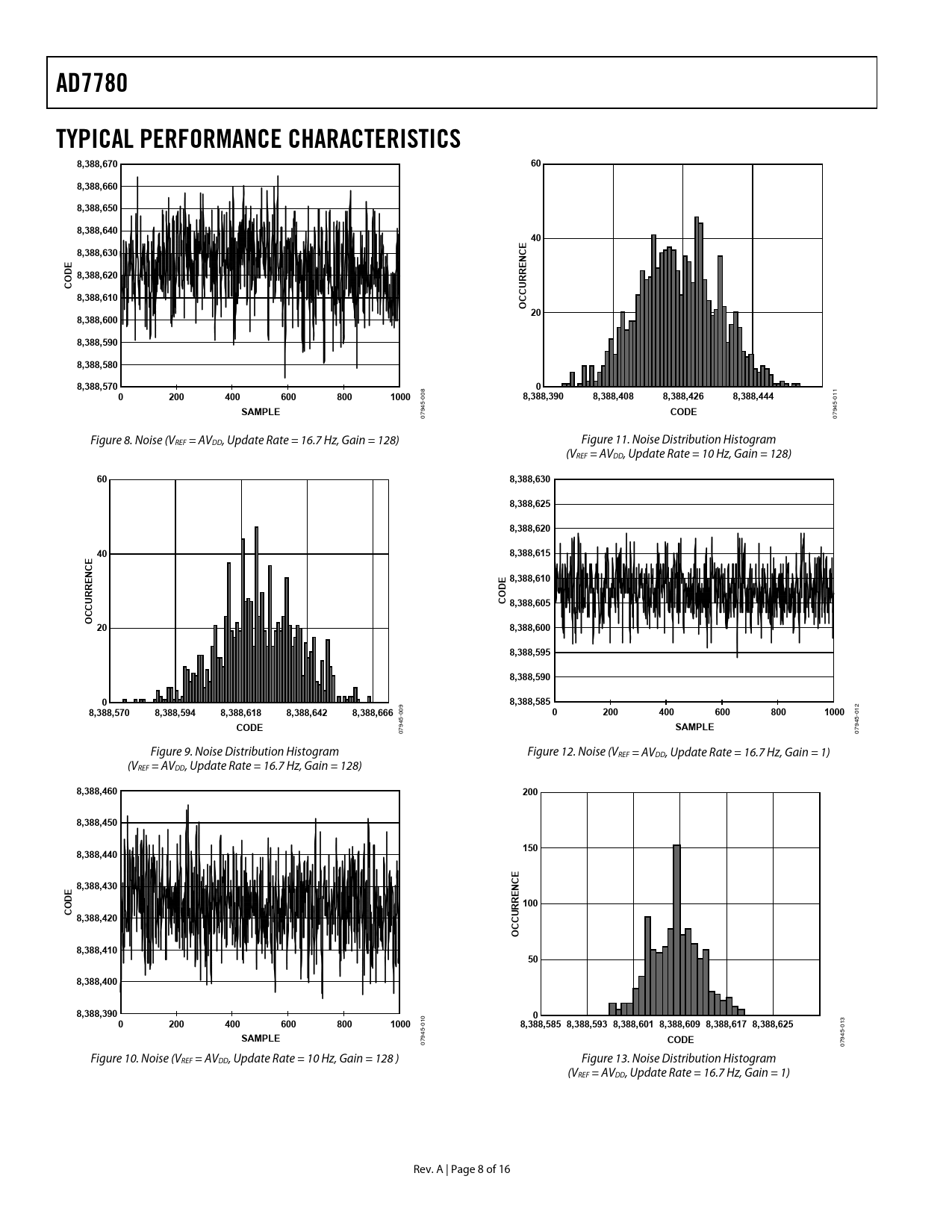 94 07 07 Figure 8. Noise (VREF = AVDD, Update Rate = 16.7 Hz, Gain = 128) Figure 11. Noise Distribution Histogram (VREF = AVDD, Update Rate = 10 Hz, Gain = 128)