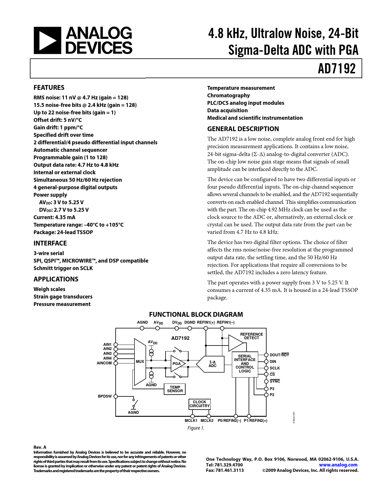 4.8 kHz, Ultralow Noise, 24-Bit. Sigma-Delta ADC with PGA. AD7192. FEATURES. Temperature measurement