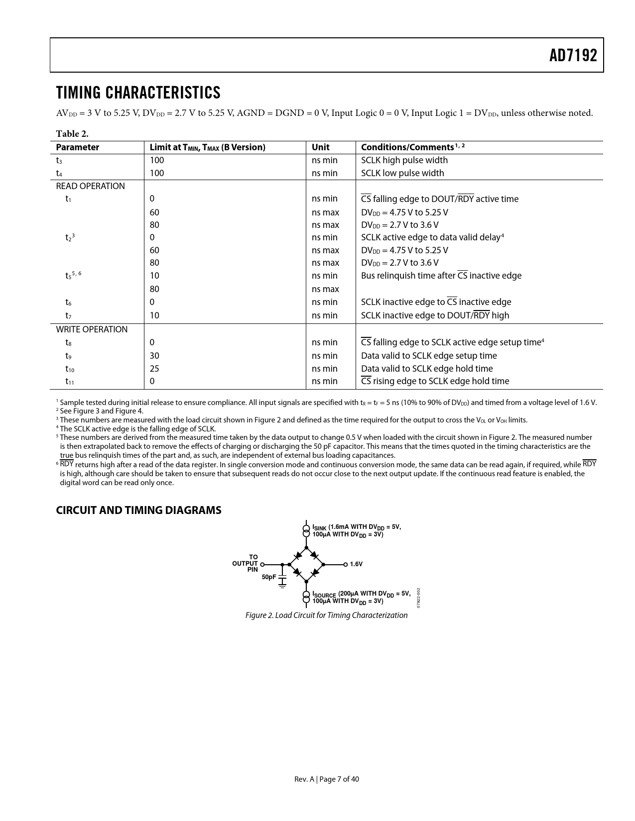 AD7192. TIMING CHARACTERISTICS. Table 2. Parameter Limit. TMIN, TMAX (B Version). Unit. Conditions/Comments1, 2