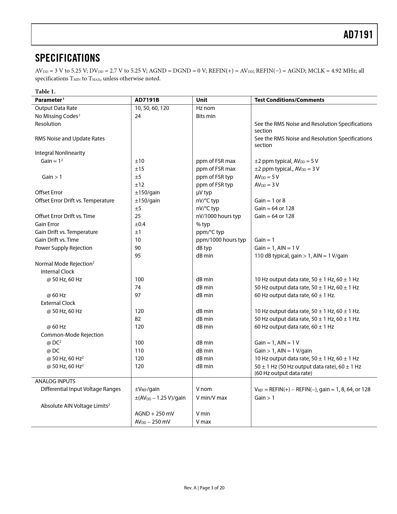 AD7191. SPECIFICATIONS. Table 1. Parameter1. AD7191B. Unit. Test Conditions/Comments