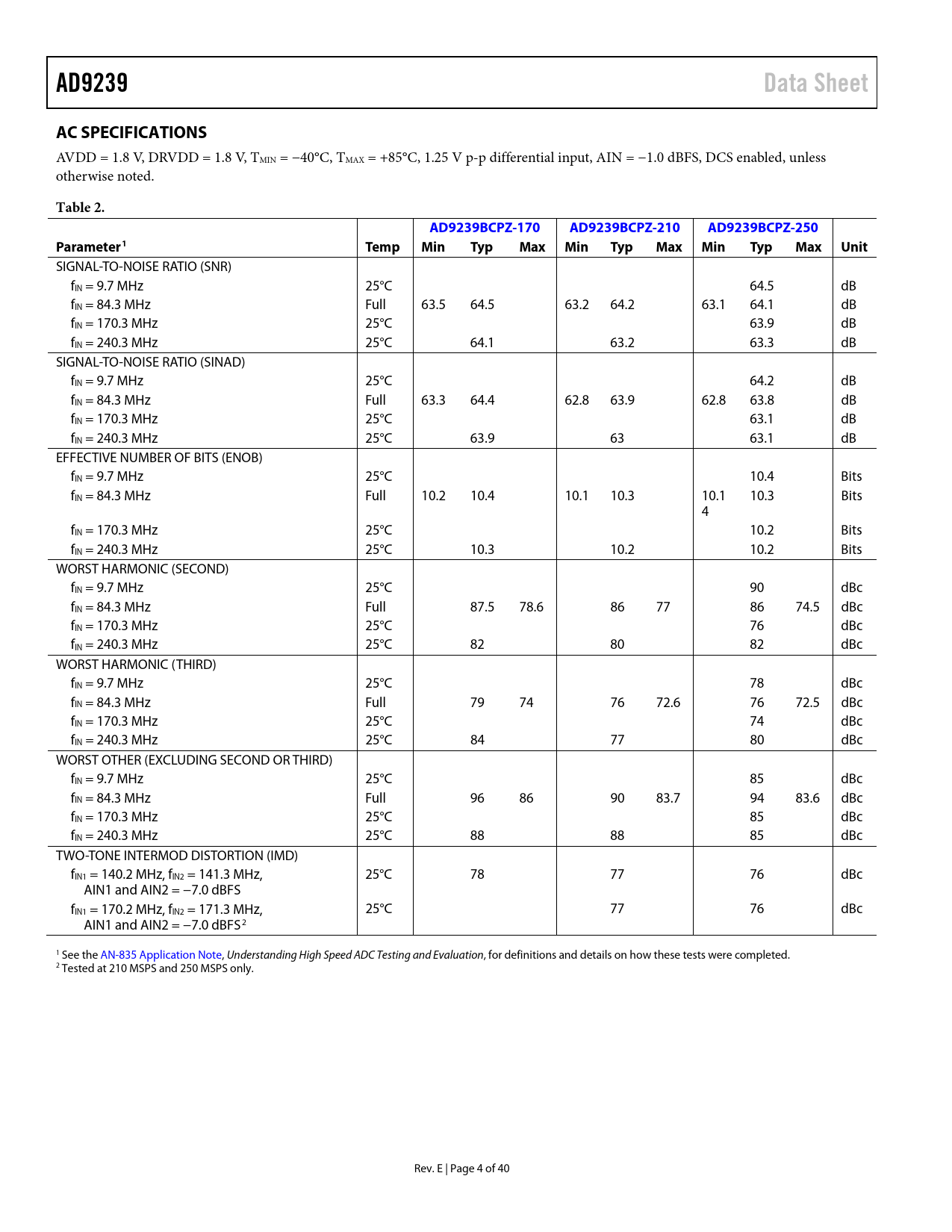 | Páginas / Página | 41 / 5 — AD9239. Data Sheet. AC SPECIFICATIONS. Table 2. AD9239BCPZ-170. … |