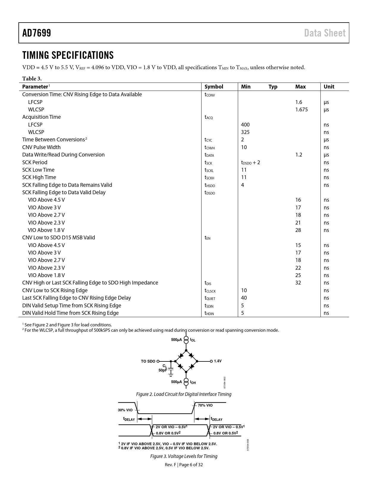 AD7699. Data Sheet. TIMING SPECIFICATIONS. Table 3. Parameter. Symbol. Min. Typ. Max. Unit. 500µA. IOL. TO SDO. 1.4V. 50pF. IOH. 70% VIO. 30% VIO. tDELAY