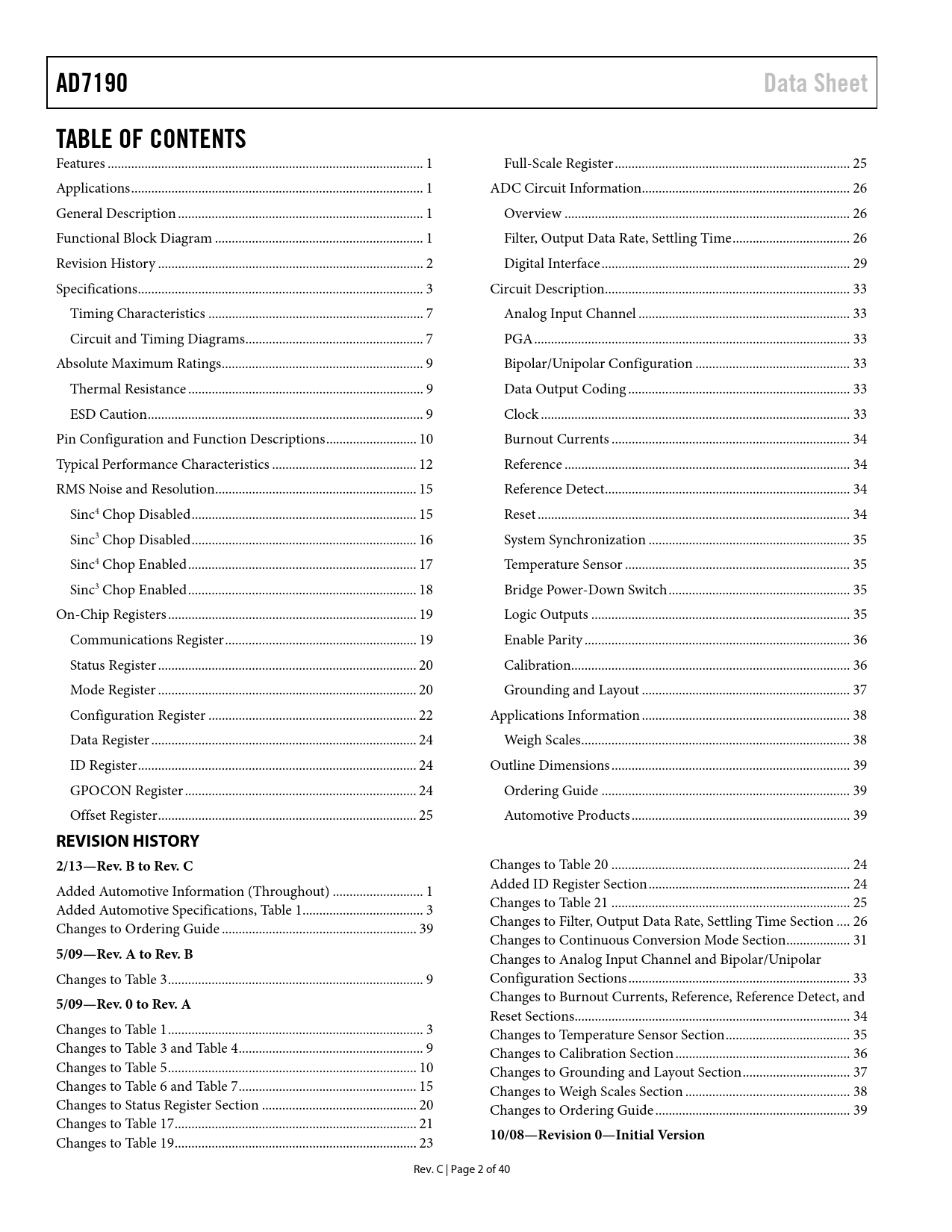 AD7190 Data Sheet TABLE OF CONTENTS REVISION HISTORY 2/13—Rev B to Rev C 5/09—Rev A to Rev B 5/09—Rev 0 to Rev A