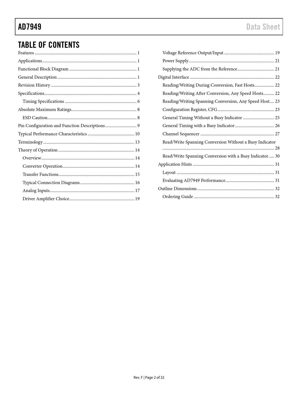 link to page 1 link to page 1 link to page 1 link to page 1 link to page 3 link to page 4 link to page 6 link to page 8 link to page 8 link to page 9 link to page 10 link to page 13 link to page 14 link to page 14 link to page 14 link to page 15 link to page 16 link to page 17 link to page 19 link to page 19 link to page 21 link to page 21 link to page 22 link to page 22 link to page 22 link to page 23 link to page 23 link to page 25 link to page 26 link to page 27 link to page 28 link to page 28 link to page 30 link to page 31 link to page 31 link to page 31 link to page 32 link to page 32 AD7949Data SheetTABLE OF CONTENTS Features .. 1 Voltage Reference Output/Input .. 19 Applications ... 1 Power Supply ... 21 Functional Block Diagram .. 1 Supplying the ADC from the Reference .. 21 General Description ... 1 Digital Interface .. 22 Revision History ... 3 Reading/Writing During Conversion, Fast Hosts .. 22 Specifications ... 4 Reading/Writing After Conversion, Any Speed Hosts .. 22 Timing Specifications .. 6 Reading/Writing Spanning Conversion, Any Speed Host .. 23 Absolute Maximum Ratings .. 8 Configuration Register, CFG .. 23 ESD Caution .. 8 General Timing Without a Busy Indicator ... 25 Pin Configuration and Function Descriptions ... 9 General Timing with a Busy Indicator .. 26 Typical Performance Characteristics ... 10 Channel Sequencer .. 27 Terminology .. 13 Read/Write Spanning Conversion Without a Busy Indicator Theory of Operation .. 14 ... 28 Overview .. 14 Read/Write Spanning Conversion with a Busy Indicator ... 30 Converter Operation .. 14 Application Hints ... 31 Transfer Functions.. 15 Layout .. 31 Typical Connection Diagrams .. 16 Evaluating AD7949 Performance ... 31 Analog Inputs .. 17 Outline Dimensions ... 32 Driver Amplifier Choice .. 19 Ordering Guide .. 32 Rev. F | Page 2 of 32 Document Outline FEATURES APPLICATIONS FUNCTIONAL BLOCK DIAGRAM GENERAL DESCRIPTION REVISION HISTORY SPECIFICATIONS TIMING SPECIFICATIONS ABSOLUTE MAXIMUM RATINGS ESD CAUTION PIN CONFIGURATION AND FUNCTION DESCRIPTIONS TYPICAL PERFORMANCE CHARACTERISTICS TERMINOLOGY THEORY OF OPERATION OVERVIEW CONVERTER OPERATION TRANSFER FUNCTIONS TYPICAL CONNECTION DIAGRAMS Unipolar or Bipolar Bipolar Single Supply ANALOG INPUTS Input Structure Selectable Low-Pass Filter Input Configurations Sequencer Source Resistance DRIVER AMPLIFIER CHOICE VOLTAGE REFERENCE OUTPUT/INPUT Internal Reference/Temperature Sensor External Reference and Internal Buffer External Reference Reference Decoupling POWER SUPPLY SUPPLYING THE ADC FROM THE REFERENCE DIGITAL INTERFACE READING/WRITING DURING CONVERSION, FAST HOSTS READING/WRITING AFTER CONVERSION, ANY SPEED HOSTS READING/WRITING SPANNING CONVERSION, ANY SPEED HOST CONFIGURATION REGISTER, CFG GENERAL TIMING WITHOUT A BUSY INDICATOR GENERAL TIMING WITH A BUSY INDICATOR CHANNEL SEQUENCER Examples READ/WRITE SPANNING CONVERSION WITHOUT A BUSY INDICATOR READ/WRITE SPANNING CONVERSION WITH A BUSY INDICATOR APPLICATION HINTS LAYOUT EVALUATING AD7949 PERFORMANCE OUTLINE DIMENSIONS ORDERING GUIDE