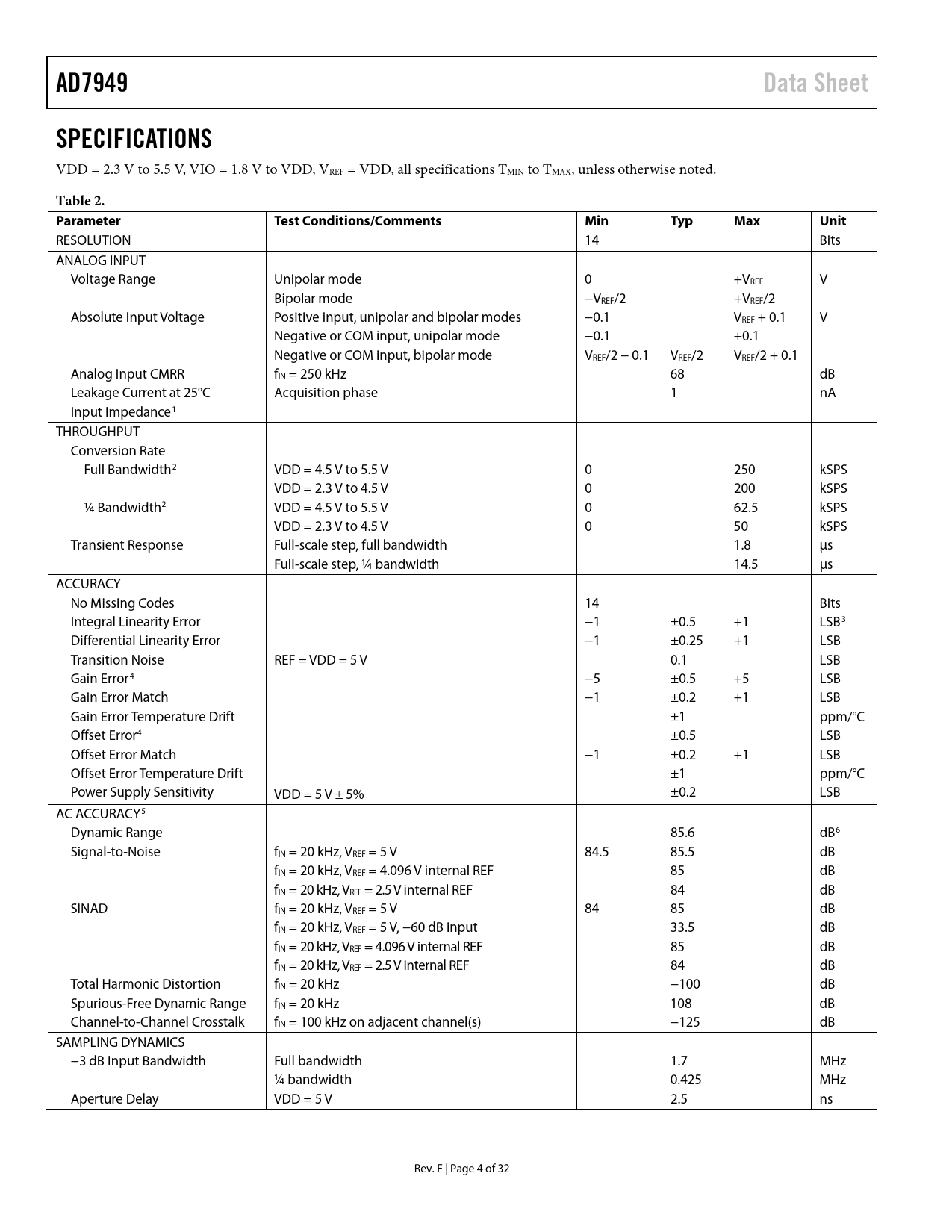 AD7949 Data Sheet SPECIFICATIONS Table 2 Parameter Test Conditions/Comments Min Typ Max Unit