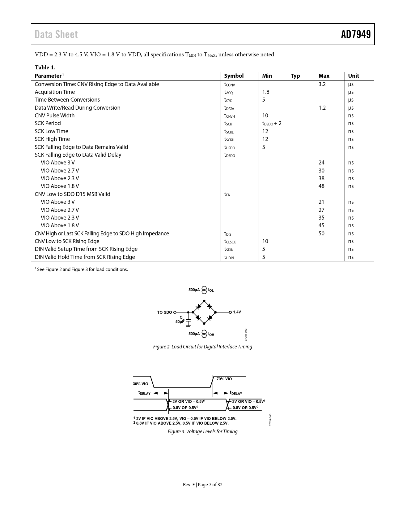 link to page 7 link to page 7 Data SheetAD7949 VDD = 2.3 V to 4.5 V, VIO = 1.8 V to VDD, all specifications TMIN to TMAX, unless otherwise noted. Table 4. Parameter1SymbolMinTypMaxUnit Conversion Time: CNV Rising Edge to Data Available tCONV 3.2 µs Acquisition Time tACQ 1.8 µs Time Between Conversions tCYC 5 µs Data Write/Read During Conversion tDATA 1.2 µs CNV Pulse Width tCNVH 10 ns SCK Period tSCK tDSDO + 2 ns SCK Low Time tSCKL 12 ns SCK High Time tSCKH 12 ns SCK Falling Edge to Data Remains Valid tHSDO 5 ns SCK Falling Edge to Data Valid Delay tDSDO VIO Above 3 V 24 ns VIO Above 2.7 V 30 ns VIO Above 2.3 V 38 ns VIO Above 1.8 V 48 ns CNV Low to SDO D15 MSB Valid tEN VIO Above 3 V 21 ns VIO Above 2.7 V 27 ns VIO Above 2.3 V 35 ns VIO Above 1.8 V 45 ns CNV High or Last SCK Fal ing Edge to SDO High Impedance tDIS 50 ns CNV Low to SCK Rising Edge tCLSCK 10 ns DIN Valid Setup Time from SCK Rising Edge tSDIN 5 ns DIN Valid Hold Time from SCK Rising Edge tHDIN 5 ns 1 See Figure 2 and Figure 3 for load conditions. 500µAIOLTO SDO1.4VCL50pF 002 500µAIOH 07351- Figure 2. Load Circuit for Digital Interface Timing 70% VIO30% VIOtDELAYtDELAY2V OR VIO – 0.5V12V OR VIO – 0.5V10.8V OR 0.5V20.8V OR 0.5V21 2V IF VIO ABOVE 2.5V, VIO – 0.5V IF VIO BELOW 2.5V. 003 2 0.8V IF VIO ABOVE 2.5V, 0.5V IF VIO BELOW 2.5V. 07351- Figure 3. Voltage Levels for Timing Rev. F | Page 7 of 32 Document Outline FEATURES APPLICATIONS FUNCTIONAL BLOCK DIAGRAM GENERAL DESCRIPTION REVISION HISTORY SPECIFICATIONS TIMING SPECIFICATIONS ABSOLUTE MAXIMUM RATINGS ESD CAUTION PIN CONFIGURATION AND FUNCTION DESCRIPTIONS TYPICAL PERFORMANCE CHARACTERISTICS TERMINOLOGY THEORY OF OPERATION OVERVIEW CONVERTER OPERATION TRANSFER FUNCTIONS TYPICAL CONNECTION DIAGRAMS Unipolar or Bipolar Bipolar Single Supply ANALOG INPUTS Input Structure Selectable Low-Pass Filter Input Configurations Sequencer Source Resistance DRIVER AMPLIFIER CHOICE VOLTAGE REFERENCE OUTPUT/INPUT Internal Reference/Temperature Sensor External Reference and Internal Buffer External Reference Reference Decoupling POWER SUPPLY SUPPLYING THE ADC FROM THE REFERENCE DIGITAL INTERFACE READING/WRITING DURING CONVERSION, FAST HOSTS READING/WRITING AFTER CONVERSION, ANY SPEED HOSTS READING/WRITING SPANNING CONVERSION, ANY SPEED HOST CONFIGURATION REGISTER, CFG GENERAL TIMING WITHOUT A BUSY INDICATOR GENERAL TIMING WITH A BUSY INDICATOR CHANNEL SEQUENCER Examples READ/WRITE SPANNING CONVERSION WITHOUT A BUSY INDICATOR READ/WRITE SPANNING CONVERSION WITH A BUSY INDICATOR APPLICATION HINTS LAYOUT EVALUATING AD7949 PERFORMANCE OUTLINE DIMENSIONS ORDERING GUIDE
