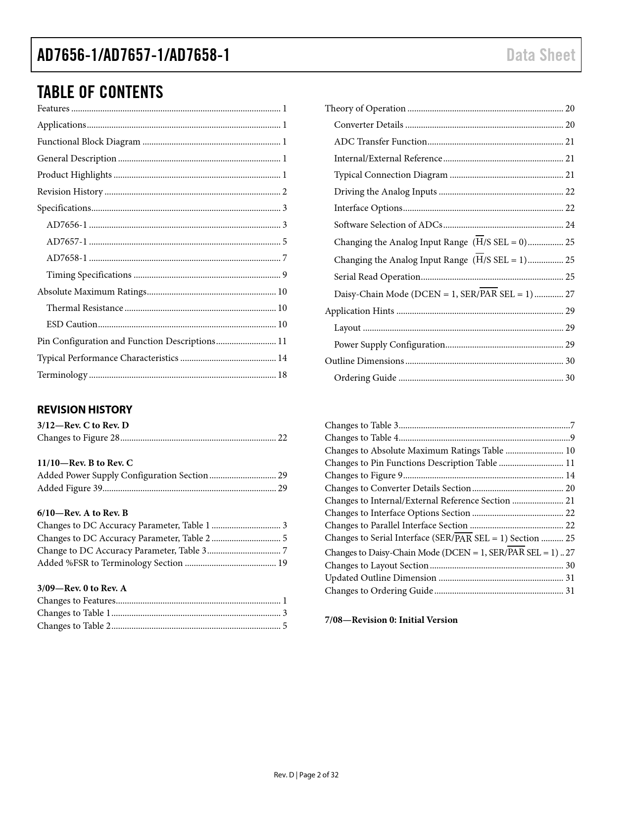 link to page 1 link to page 1 link to page 1 link to page 1 link to page 1 link to page 2 link to page 3 link to page 3 link to page 5 link to page 7 link to page 9 link to page 10 link to page 10 link to page 10 link to page 11 link to page 14 link to page 18 link to page 20 link to page 20 link to page 21 link to page 21 link to page 21 link to page 22 link to page 22 link to page 24 link to page 25 link to page 25 link to page 25 link to page 27 link to page 29 link to page 29 link to page 29 link to page 30 link to page 30 AD7656-1/AD7657-1/AD7658-1Data SheetTABLE OF CONTENTS Features .. 1 Theory of Operation .. 20 Applications ... 1 Converter Details ... 20 Functional Block Diagram .. 1 ADC Transfer Function ... 21 General Description ... 1 Internal/External Reference .. 21 Product Highlights ... 1 Typical Connection Diagram ... 21 Revision History ... 2 Driving the Analog Inputs .. 22 Specifications ... 3 Interface Options .. 22 AD7656-1 .. 3 Software Selection of ADCs .. 24 AD7657-1 .. 5 Changing the Analog Input Range (H/S SEL = 0) .. 25 AD7658-1 .. 7 Changing the Analog Input Range (H/S SEL = 1) .. 25 Timing Specifications .. 9 Serial Read Operation .. 25 Absolute Maximum Ratings .. 10 Daisy-Chain Mode (DCEN = 1, SER/PAR SEL = 1) ... 27 Thermal Resistance .. 10 Application Hints ... 29 ESD Caution .. 10 Layout .. 29 Pin Configuration and Function Descriptions ... 11 Power Supply Configuration... 29 Typical Performance Characteristics ... 14 Outline Dimensions ... 30 Terminology .. 18 Ordering Guide .. 30 REVISION HISTORY 3/12—Rev. C to Rev. D Changes to Table 3 ... 7 Changes to Figure 28 .. 22 Changes to Table 4 ... 9 Changes to Absolute Maximum Ratings Table .. 10 11/10—Rev. B to Rev. C Changes to Pin Functions Description Table ... 11 Added Power Supply Configuration Section .. 29 Changes to Figure 9 .. 14 Added Figure 39 .. 29 Changes to Converter Details Section ... 20 Changes to Internal/External Reference Section ... 21 6/10—Rev. A to Rev. B Changes to Interface Options Section ... 22 Changes to DC Accuracy Parameter, Table 1 ... 3 Changes to Parallel Interface Section .. 22 Changes to DC Accuracy Parameter, Table 2 ... 5 Changes to Serial Interface (SER/PAR SEL = 1) Section .. 25 Change to DC Accuracy Parameter, Table 3 ... 7 Changes to Daisy-Chain Mode (DCEN = 1, SER/PAR SEL = 1) . 27 Added %FSR to Terminology Section ... 19 Changes to Layout Section .. 30 Updated Outline Dimension .. 31 3/09—Rev. 0 to Rev. A Changes to Ordering Guide .. 31 Changes to Features .. 1 Changes to Table 1 .. 3 Changes to Table 2 .. 5 7/08—Revision 0: Initial Version Rev. D | Page 2 of 32 Document Outline Features Applications Functional Block Diagram General Description Product Highlights Table of Contents Revision History Specifications AD7656-1 AD7657-1 AD7658-1 Timing Specifications Absolute Maximum Ratings Thermal Resistance ESD Caution Pin Configuration and Function Descriptions Typical Performance Characteristics Terminology Theory of Operation Converter Details Track-and-Hold Amplifiers Analog Input ADC Transfer Function Internal/External Reference Typical Connection Diagram Driving the Analog Inputs Interface Options Parallel Interface (SER/PAR SEL = 0) Software Selection of ADCs Changing the Analog Input Range (H/S SEL = 0) Changing the Analog Input Range (H/S SEL = 1) Serial Interface (SER/PAR SEL = 1) Serial Read Operation Daisy-Chain Mode (DCEN = 1, SER/ SEL = 1) Standby/Partial Power-Down Modes of Operation (SER/PAR SEL = 0 or 1) Application Hints Layout Power Supply Configuration Outline Dimensions Ordering Guide