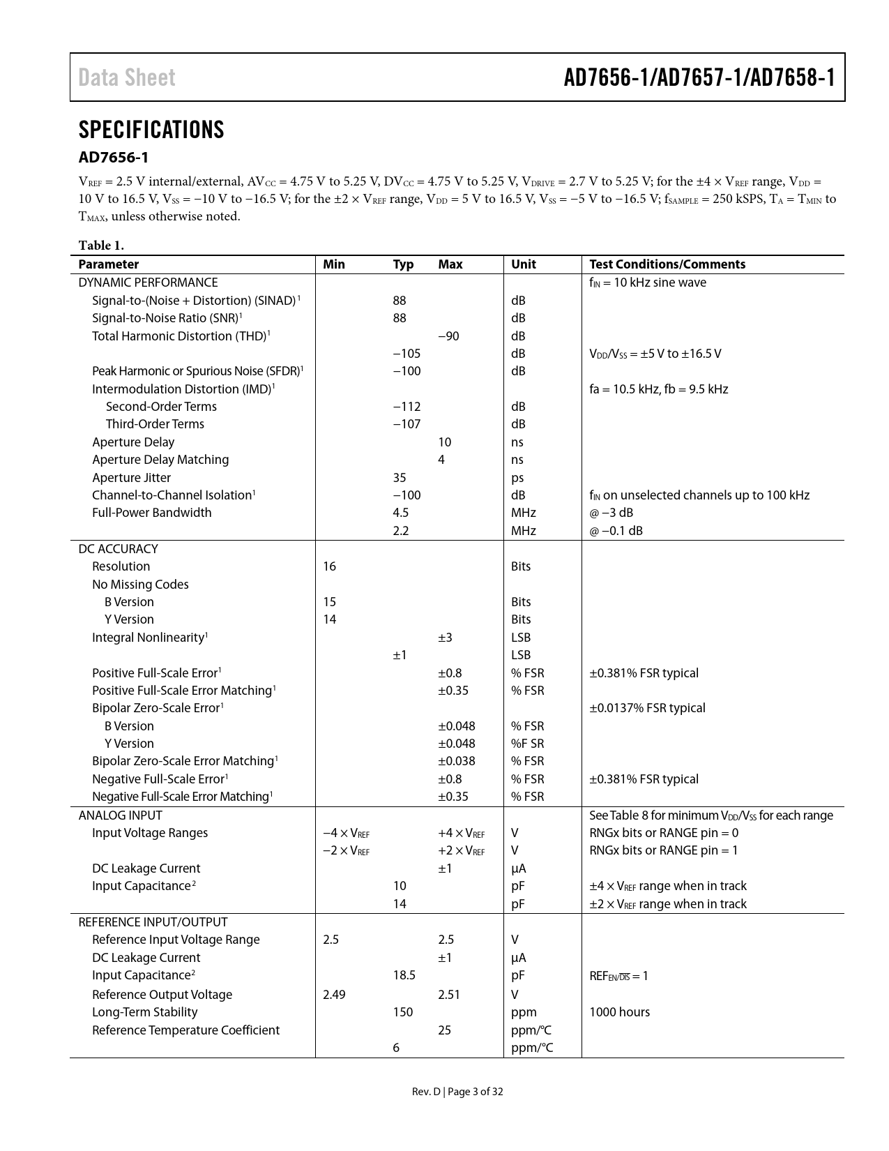 Data Sheet AD7656-1/AD7657-1/AD7658-1 SPECIFICATIONS AD7656-1 Table 1 Parameter Min Typ Max Unit Test Conditions/Comments