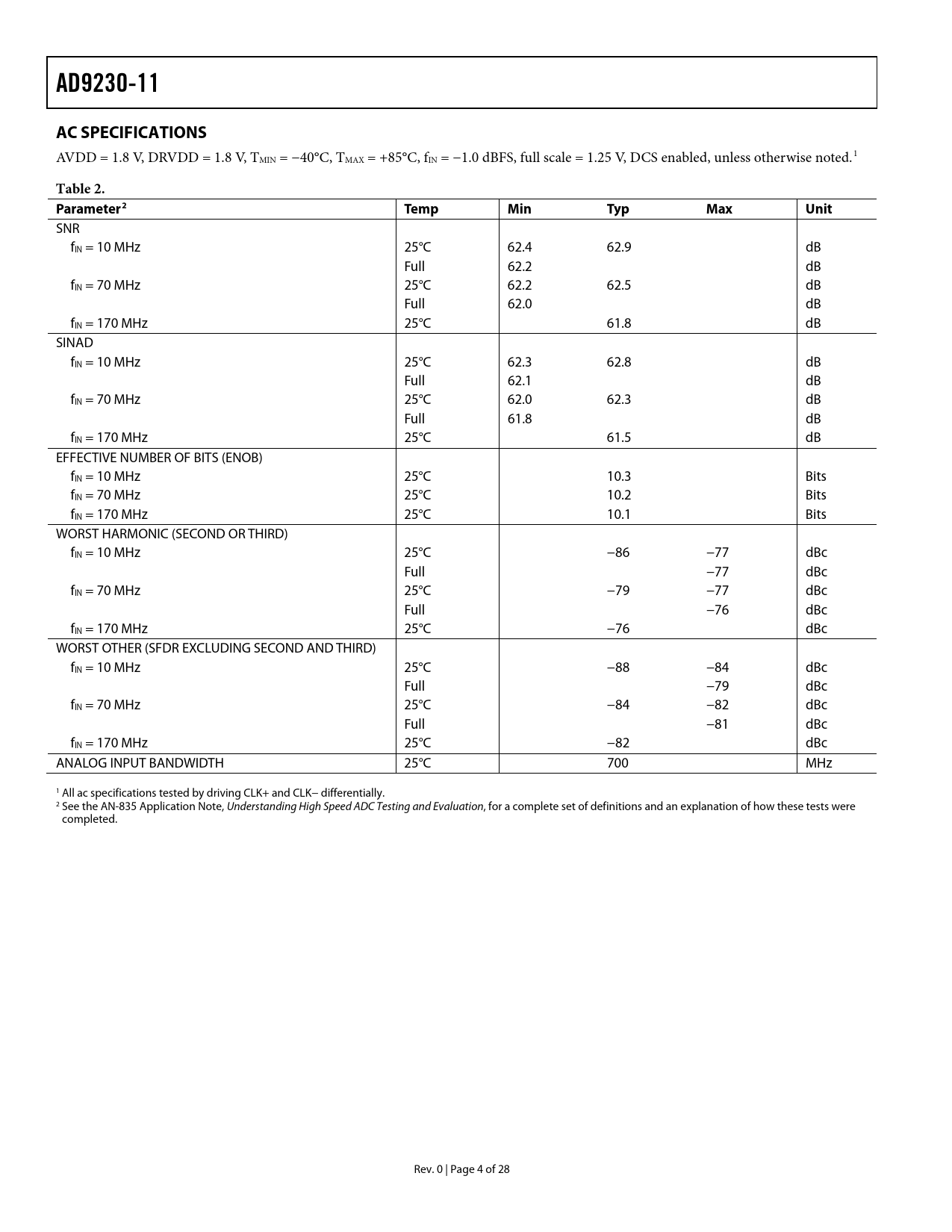 AD9230-11. AC SPECIFICATIONS. Table 2. Parameter2. Temp. Min. Typ. Max. Unit