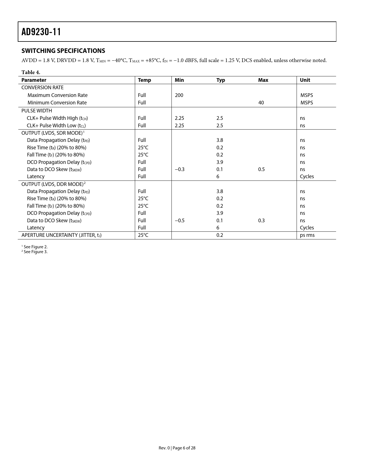 AD9230-11 SWITCHING SPECIFICATIONS Table 4 Parameter Temp Min Typ Max Unit