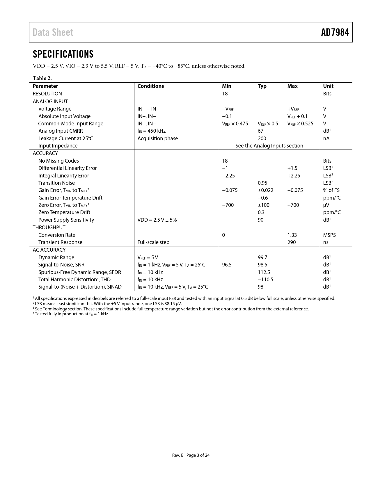 link to page 15 link to page 4 link to page 12 Data SheetAD7984SPECIFICATIONS VDD = 2.5 V, VIO = 2.3 V to 5.5 V, REF = 5 V, TA = −40°C to +85°C, unless otherwise noted. Table 2. ParameterConditionsMinTypMaxUnit RESOLUTION 18 Bits ANALOG INPUT Voltage Range IN+ − IN− −VREF +VREF V Absolute Input Voltage IN+, IN− −0.1 VREF + 0.1 V Common-Mode Input Range IN+, IN− VREF × 0.475 VREF × 0.5 VREF × 0.525 V Analog Input CMRR fIN = 450 kHz 67 dB1 Leakage Current at 25°C Acquisition phase 200 nA Input Impedance See the Analog Inputs section ACCURACY No Missing Codes 18 Bits Differential Linearity Error −1 +1.5 LSB2 Integral Linearity Error −2.25 +2.25 LSB2 Transition Noise 0.95 LSB2 Gain Error, T 3 MIN to TMAX −0.075 ±0.022 +0.075 % of FS Gain Error Temperature Drift −0.6 ppm/°C Zero Error, T 3 MIN to TMAX −700 ±100 +700 µV Zero Temperature Drift 0.3 ppm/°C Power Supply Sensitivity VDD = 2.5 V ± 5% 90 dB1 THROUGHPUT Conversion Rate 0 1.33 MSPS Transient Response Full-scale step 290 ns AC ACCURACY Dynamic Range VREF = 5 V 99.7 dB1 Signal-to-Noise, SNR fIN = 1 kHz, VREF = 5 V, TA = 25°C 96.5 98.5 dB1 Spurious-Free Dynamic Range, SFDR fIN = 10 kHz 112.5 dB1 Total Harmonic Distortion4, THD fIN = 10 kHz −110.5 dB1 Signal-to-(Noise + Distortion), SINAD fIN = 10 kHz, VREF = 5 V, TA = 25°C 98 dB1 1 All specifications expressed in decibels are referred to a full-scale input FSR and tested with an input signal at 0.5 dB below ful scale, unless otherwise specified. 2 LSB means least significant bit. With the ±5 V input range, one LSB is 38.15 µV. 3 See Terminology section. These specifications include full temperature range variation but not the error contribution from the external reference. 4 Tested fully in production at fIN = 1 kHz. Rev. B | Page 3 of 24 Document Outline FEATURES APPLICATIONS APPLICATION DIAGRAM GENERAL DESCRIPTION TABLE OF CONTENTS REVISION HISTORY SPECIFICATIONS TIMING SPECIFICATIONS ABSOLUTE MAXIMUM RATINGS ESD CAUTION PIN CONFIGURATIONS AND FUNCTION DESCRIPTIONS TYPICAL PERFORMANCE CHARACTERISTICS TERMINOLOGY THEORY OF OPERATION CIRCUIT INFORMATION CONVERTER OPERATION Transfer Functions TYPICAL CONNECTION DIAGRAM ANALOG INPUTS DRIVER AMPLIFIER CHOICE SINGLE-TO-DIFFERENTIAL DRIVER VOLTAGE REFERENCE INPUT POWER SUPPLY DIGITAL INTERFACE MODE, 3-CS WIRE WITHOUT BUSY INDICATOR CS MODE, 3-WIRE WITH BUSY INDICATOR CS MODE, 4-WIRE WITHOUT BUSY INDICATOR CS MODE, 4-WIRE WITH BUSY INDICATOR CHAIN MODE WITHOUT BUSY INDICATOR CHAIN MODE WITH BUSY INDICATOR APPLICATION HINTS LAYOUT EVALUATING THE AD7984 PERFORMANCE OUTLINE DIMENSIONS ORDERING GUIDE