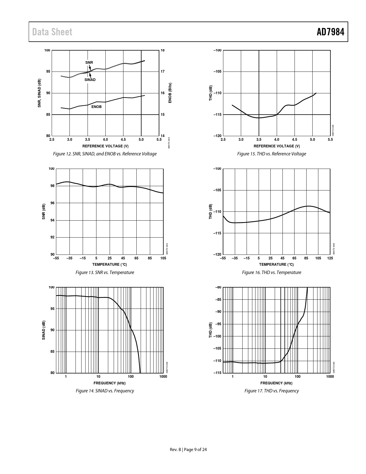 Data SheetAD798410018–100SNR9517–105B)SINADdts)B)BidINAD (9016B (–110SHD (NOTENR, SENOB8515–115 045 8014–120 06973- 2.53.03.54.04.55.05.5 043 2.53.03.54.04.55.05.5REFERENCE VOLTAGE (V)REFERENCE VOLTAGE (V) 06973- Figure 12. SNR, SINAD, and ENOB vs. Reference Voltage Figure 15. THD vs. Reference Voltage 100–10098–10596B)B)dd –110NR (HD (ST94–11592 044 046 90 06973- –120 06973- –55–35–15525456585105–55–35–15525456585105125TEMPERATURE (°C)TEMPERATURE (°C) Figure 13. SNR vs. Temperature Figure 16. THD vs. Temperature 100–80–8595–90B) dB)–95d90HD (INAD (T –100S–10585–110 034 040 80 06973- –115 06973- 11010010001101001000FREQUENCY (kHz)FREQUENCY (kHz) Figure 14. SINAD vs. Frequency Figure 17. THD vs. Frequency Rev. B | Page 9 of 24 Document Outline FEATURES APPLICATIONS APPLICATION DIAGRAM GENERAL DESCRIPTION TABLE OF CONTENTS REVISION HISTORY SPECIFICATIONS TIMING SPECIFICATIONS ABSOLUTE MAXIMUM RATINGS ESD CAUTION PIN CONFIGURATIONS AND FUNCTION DESCRIPTIONS TYPICAL PERFORMANCE CHARACTERISTICS TERMINOLOGY THEORY OF OPERATION CIRCUIT INFORMATION CONVERTER OPERATION Transfer Functions TYPICAL CONNECTION DIAGRAM ANALOG INPUTS DRIVER AMPLIFIER CHOICE SINGLE-TO-DIFFERENTIAL DRIVER VOLTAGE REFERENCE INPUT POWER SUPPLY DIGITAL INTERFACE MODE, 3-CS WIRE WITHOUT BUSY INDICATOR CS MODE, 3-WIRE WITH BUSY INDICATOR CS MODE, 4-WIRE WITHOUT BUSY INDICATOR CS MODE, 4-WIRE WITH BUSY INDICATOR CHAIN MODE WITHOUT BUSY INDICATOR CHAIN MODE WITH BUSY INDICATOR APPLICATION HINTS LAYOUT EVALUATING THE AD7984 PERFORMANCE OUTLINE DIMENSIONS ORDERING GUIDE