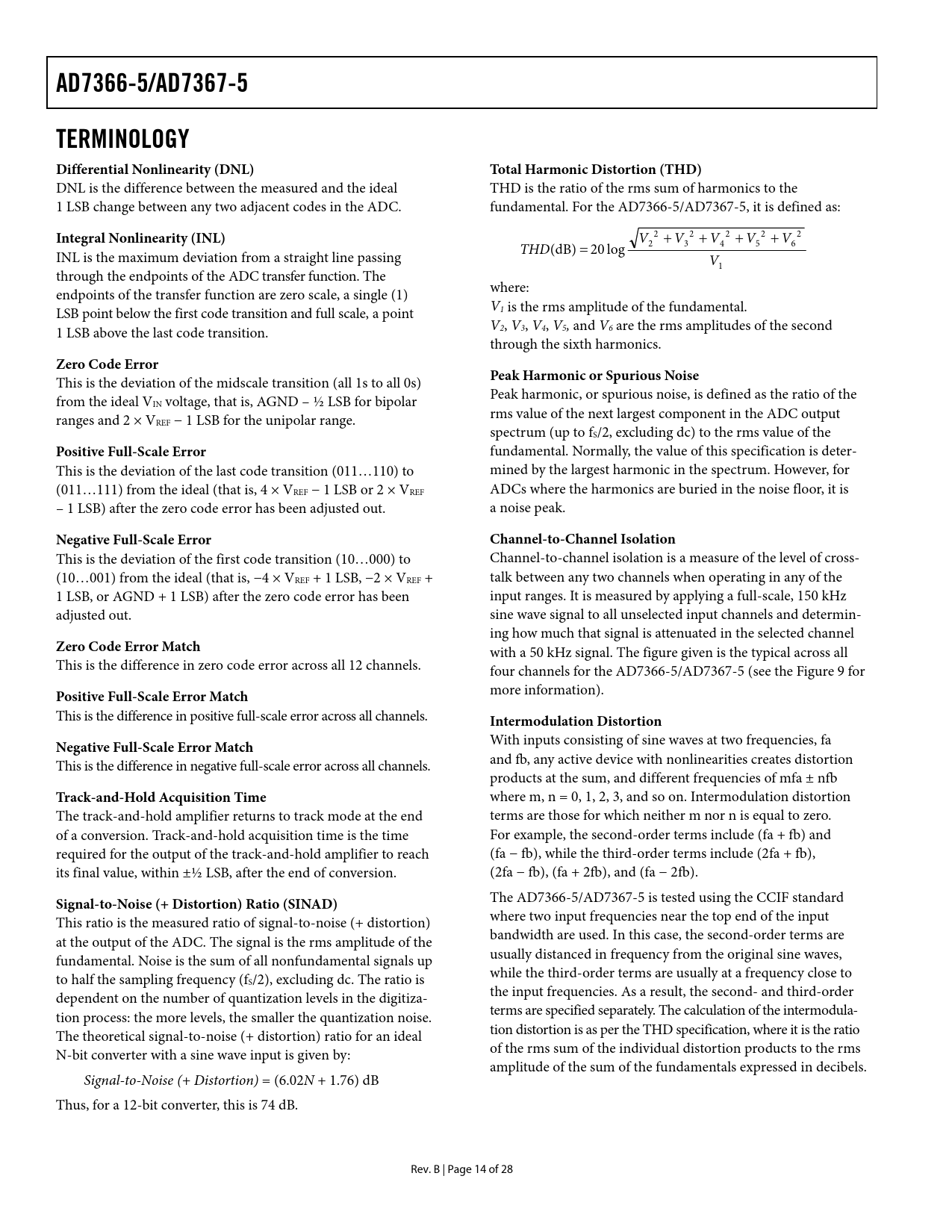 link to page 12 AD7366-5/AD7367-5TERMINOLOGY Differential Nonlinearity (DNL)Total Harmonic Distortion (THD) DNL is the difference between the measured and the ideal THD is the ratio of the rms sum of harmonics to the 1 LSB change between any two adjacent codes in the ADC. fundamental. For the AD7366-5/AD7367-5, it is defined as: Integral Nonlinearity (INL) 2 2 2 2 2 V + V + V + V + V 2 3 4 5 6 THD(dB) = 20 log INL is the maximum deviation from a straight line passing V1 through the endpoints of the ADC transfer function. The where: endpoints of the transfer function are zero scale, a single (1) V LSB point below the first code transition and full scale, a point 1 is the rms amplitude of the fundamental. V 1 LSB above the last code transition. 2, V3, V4, V5, and V6 are the rms amplitudes of the second through the sixth harmonics. Zero Code ErrorPeak Harmonic or Spurious Noise This is the deviation of the midscale transition (all 1s to all 0s) Peak harmonic, or spurious noise, is defined as the ratio of the from the ideal VIN voltage, that is, AGND – ½ LSB for bipolar rms value of the next largest component in the ADC output ranges and 2 × VREF − 1 LSB for the unipolar range. spectrum (up to fS/2, excluding dc) to the rms value of the Positive Full-Scale Error fundamental. Normally, the value of this specification is deter- This is the deviation of the last code transition (011…110) to mined by the largest harmonic in the spectrum. However, for (011…111) from the ideal (that is, 4 × VREF − 1 LSB or 2 × VREF ADCs where the harmonics are buried in the noise floor, it is – 1 LSB) after the zero code error has been adjusted out. a noise peak. Negative Full-Scale ErrorChannel-to-Channel Isolation This is the deviation of the first code transition (10…000) to Channel-to-channel isolation is a measure of the level of cross- (10…001) from the ideal (that is, −4 × VREF + 1 LSB, −2 × VREF + talk between any two channels when operating in any of the 1 LSB, or AGND + 1 LSB) after the zero code error has been input ranges. It is measured by applying a full-scale, 150 kHz adjusted out. sine wave signal to all unselected input channels and determin- ing how much that signal is attenuated in the selected channel Zero Code Error Match with a 50 kHz signal. The figure given is the typical across all This is the difference in zero code error across all 12 channels. four channels for the AD7366-5/AD7367-5 (see the Figure 9 for Positive Full-Scale Error Match more information). This is the difference in positive full-scale error across all channels. Intermodulation DistortionNegative Full-Scale Error Match With inputs consisting of sine waves at two frequencies, fa This is the difference in negative full-scale error across all channels. and fb, any active device with nonlinearities creates distortion products at the sum, and different frequencies of mfa ± nfb Track-and-Hold Acquisition Time where m, n = 0, 1, 2, 3, and so on. Intermodulation distortion The track-and-hold amplifier returns to track mode at the end terms are those for which neither m nor n is equal to zero. of a conversion. Track-and-hold acquisition time is the time For example, the second-order terms include (fa + fb) and required for the output of the track-and-hold amplifier to reach (fa − fb), while the third-order terms include (2fa + fb), its final value, within ±½ LSB, after the end of conversion. (2fa − fb), (fa + 2fb), and (fa − 2fb). Signal-to-Noise (+ Distortion) Ratio (SINAD) The AD7366-5/AD7367-5 is tested using the CCIF standard This ratio is the measured ratio of signal-to-noise (+ distortion) where two input frequencies near the top end of the input at the output of the ADC. The signal is the rms amplitude of the bandwidth are used. In this case, the second-order terms are fundamental. Noise is the sum of all nonfundamental signals up usually distanced in frequency from the original sine waves, to half the sampling frequency (f while the third-order terms are usually at a frequency close to S/2), excluding dc. The ratio is dependent on the number of quantization levels in the digitiza- the input frequencies. As a result, the second- and third-order tion process: the more levels, the smaller the quantization noise. terms are specified separately. The calculation of the intermodula- The theoretical signal-to-noise (+ distortion) ratio for an ideal tion distortion is as per the THD specification, where it is the ratio N-bit converter with a sine wave input is given by: of the rms sum of the individual distortion products to the rms amplitude of the sum of the fundamentals expressed in decibels. Signal-to-Noise (+ Distortion) = (6.02N + 1.76) dB Thus, for a 12-bit converter, this is 74 dB. Rev. B | Page 14 of 28 Document Outline FEATURES FUNCTIONAL BLOCK DIAGRAM GENERAL DESCRIPTION PRODUCT HIGHLIGHTS TABLE OF CONTENTS REVISION HISTORY SPECIFICATIONS AD7366-5 SPECIFICATIONS AD7367-5 SPECIFICATIONS TIMING SPECIFICATIONS ABSOLUTE MAXIMUM RATINGS ESD CAUTION PIN CONFIGURATION AND FUNCTION DESCRIPTIONS TYPICAL PERFORMANCE CHARACTERISTICS TERMINOLOGY THEORY OF OPERATION CIRCUIT INFORMATION CONVERTER OPERATION ANALOG INPUTS TRANSFER FUNCTION Track-and-Hold TYPICAL CONNECTION DIAGRAM DRIVER AMPLIFIER CHOICE VDRIVE REFERENCE MODES OF OPERATION NORMAL MODE SHUTDOWN MODE POWER-UP TIMES SERIAL INTERFACE MICROPROCESSOR INTERFACING AD7366-5/AD7367-5 TO ADSP-218x AD7366-5/AD7367-5 TO ADSP-BF53x AD7366-5/AD7367-5 TO TMS320VC5506 AD7366-5/AD7367-5 TO DSP563xx APPLICATION HINTS LAYOUT AND GROUNDING EVALUATING THE AD7366-5/AD7367-5 OUTLINE DIMENSIONS ORDERING GUIDE
