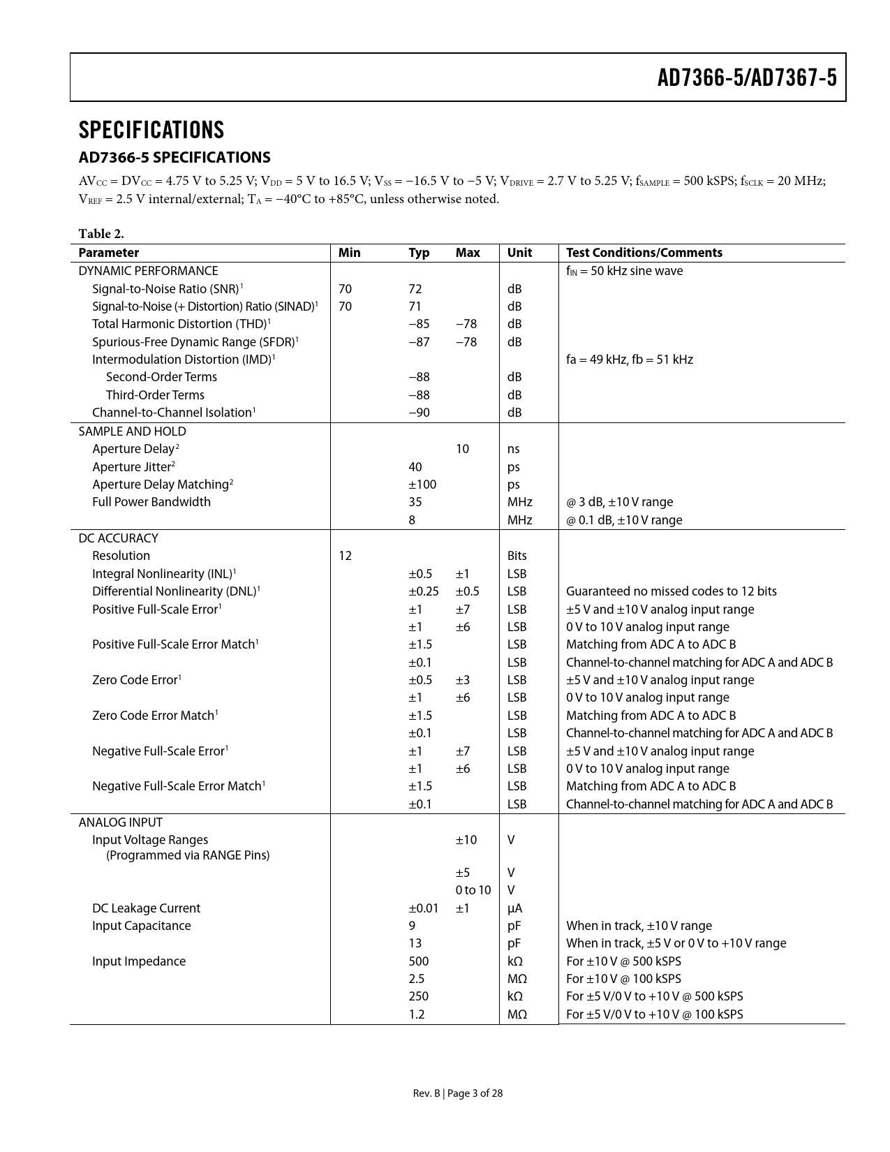 AD7366-5/AD7367-5 SPECIFICATIONS AD7366-5 SPECIFICATIONS Table 2 Parameter Min Typ Max Unit Test Conditions/Comments