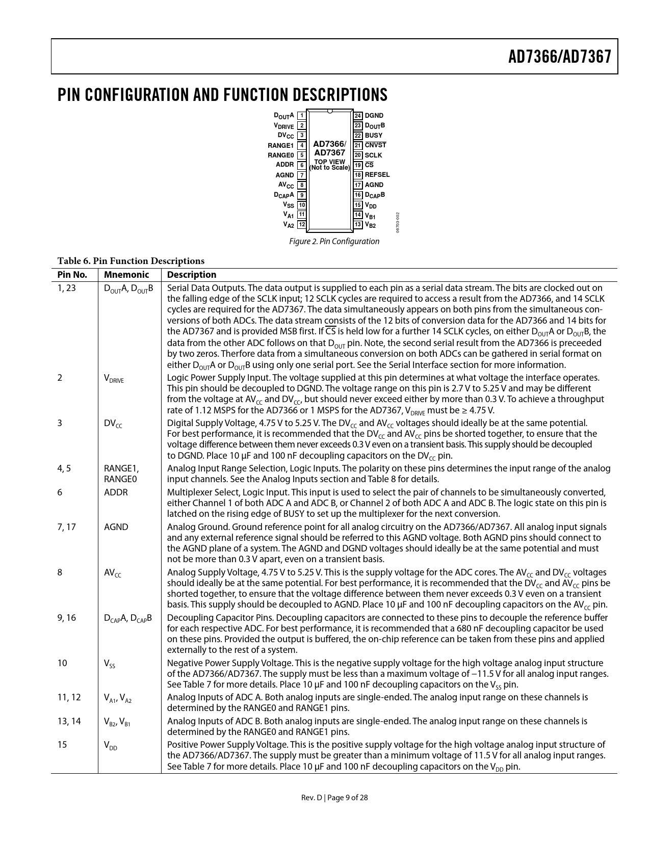 AD7366/AD7367. PIN CONFIGURATION AND FUNCTION DESCRIPTIONS. DOUTA 1. 24 DGND. 23 D. DRIVE. OUTB. BUSY. RANGE1. AD7366/. 21 CNVST. RANGE0
