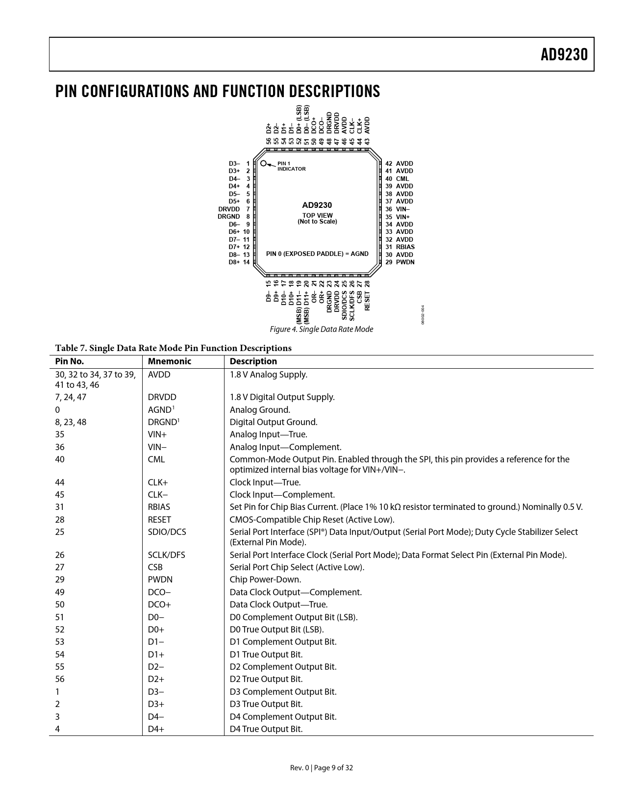30, 32 to 34, 37 to 39, AVDD 1.8 V Analog Supply. 41 to 43, 46 7, 24, 47 DRVDD 1.8 V Digital Output Supply. 0 AGND1 Analog Ground. 8, 23, 48 DRGND1 Digital Output Ground. 35 VIN+ Analog Input—True. 36 VIN− Analog Input—Complement. 40 CML Common-Mode Output Pin. Enabled through the SPI, this pin provides a reference for the optimized internal bias voltage for VIN+/VIN−. 44 CLK+ Clock Input—True. 45 CLK− Clock Input—Complement. 31 RBIAS Set Pin for Chip Bias Current. (Place 1% 10 kΩ resistor terminated to ground.) Nominally 0.5 V. 28 RESET CMOS-Compatible Chip Reset (Active Low). 25 SDIO/DCS Serial Port Interface (SPI®) Data Input/Output (Serial Port Mode); Duty Cycle Stabilizer Select (External Pin Mode). 26 SCLK/DFS Serial Port Interface Clock (Serial Port Mode); Data Format Select Pin (External Pin Mode). 27 CSB Serial Port Chip Select (Active Low). 29 PWDN Chip Power-Down. 49 DCO− Data Clock Output—Complement. 50 DCO+ Data Clock Output—True. 51 D0− D0 Complement Output Bit (LSB). 52 D0+ D0 True Output Bit (LSB). 53 D1− D1 Complement Output Bit. 54 D1+ D1 True Output Bit. 55 D2− D2 Complement Output Bit. 56 D2+ D2 True Output Bit. 1 D3− D3 Complement Output Bit. 2 D3+ D3 True Output Bit. 3 D4− D4 Complement Output Bit. 4 D4+ D4 True Output Bit. Rev. 0 | Page 9 of 32 Document Outline FEATURES APPLICATIONS FUNCTIONAL BLOCK DIAGRAM GENERAL DESCRIPTION PRODUCT HIGHLIGHTS TABLE OF CONTENTS REVISION HISTORY SPECIFICATIONS DC SPECIFICATIONS AC SPECIFICATIONS DIGITAL SPECIFICATIONS SWITCHING SPECIFICATIONS TIMING DIAGRAMS ABSOLUTE MAXIMUM RATINGS THERMAL RESISTANCE ESD CAUTION PIN CONFIGURATIONS AND FUNCTION DESCRIPTIONS EQUIVALENT CIRCUITS TYPICAL PERFORMANCE CHARACTERISTICS THEORY OF OPERATION ANALOG INPUT AND VOLTAGE REFERENCE Differential Input Configurations CLOCK INPUT CONSIDERATIONS Clock Duty Cycle Considerations Clock Jitter Considerations POWER DISSIPATION AND POWER-DOWN MODE DIGITAL OUTPUTS Digital Outputs and Timing Output Data Rate and Pinout Configuration Out-of-Range (OR) TIMING RBIAS AD9230 CONFIGURATION USING THE SPI HARDWARE INTERFACE CONFIGURATION WITHOUT THE SPI MEMORY MAP READING THE MEMORY MAP TABLE RESERVED LOCATIONS DEFAULT VALUES LOGIC LEVELS OUTLINE DIMENSIONS ORDERING GUIDE