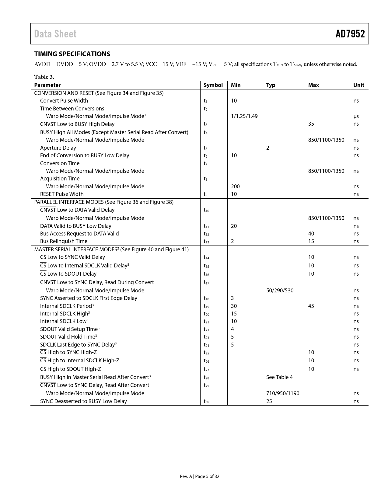 Data Sheet AD7952 TIMING SPECIFICATIONS Table 3 Parameter Symbol Min Typ Max Unit