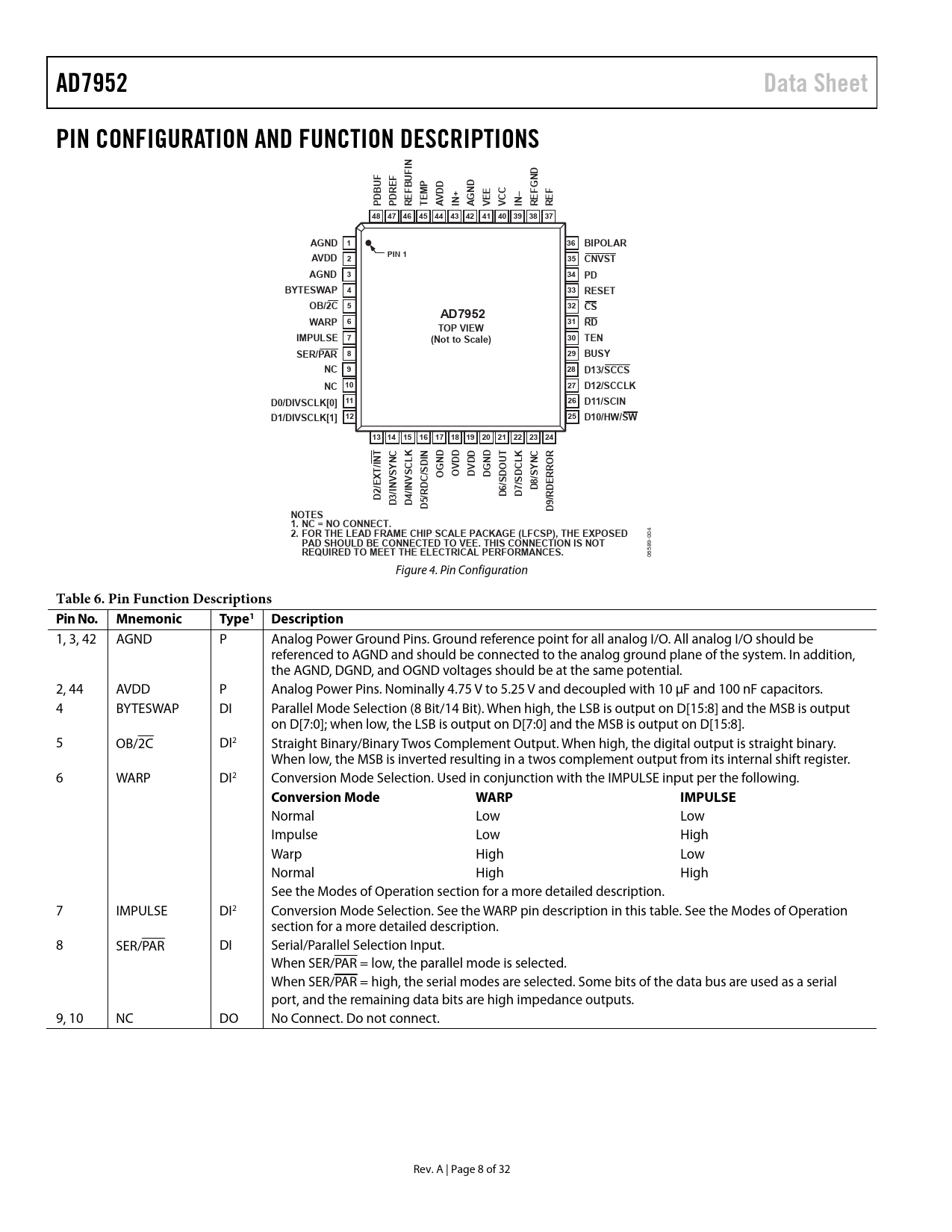 1, 3, 42 AGND P Analog Power Ground Pins. Ground reference point for all analog I/O. All analog I/O should be referenced to AGND and should be connected to the analog ground plane of the system. In addition, the AGND, DGND, and OGND voltages should be at the same potential. 2, 44 AVDD P Analog Power Pins. Nominally 4.75 V to 5.25 V and decoupled with 10 μF and 100 nF capacitors. 4 BYTESWAP DI Parallel Mode Selection (8 Bit/14 Bit). When high, the LSB is output on D[15:8] and the MSB is output on D[7:0]; when low, the LSB is output on D[7:0] and the MSB is output on D[15:8]. 5 OB/2C DI2 Straight Binary/Binary Twos Complement Output. When high, the digital output is straight binary. When low, the MSB is inverted resulting in a twos complement output from its internal shift register. 6 WARP DI2 Conversion Mode Selection. Used in conjunction with the IMPULSE input per the following.