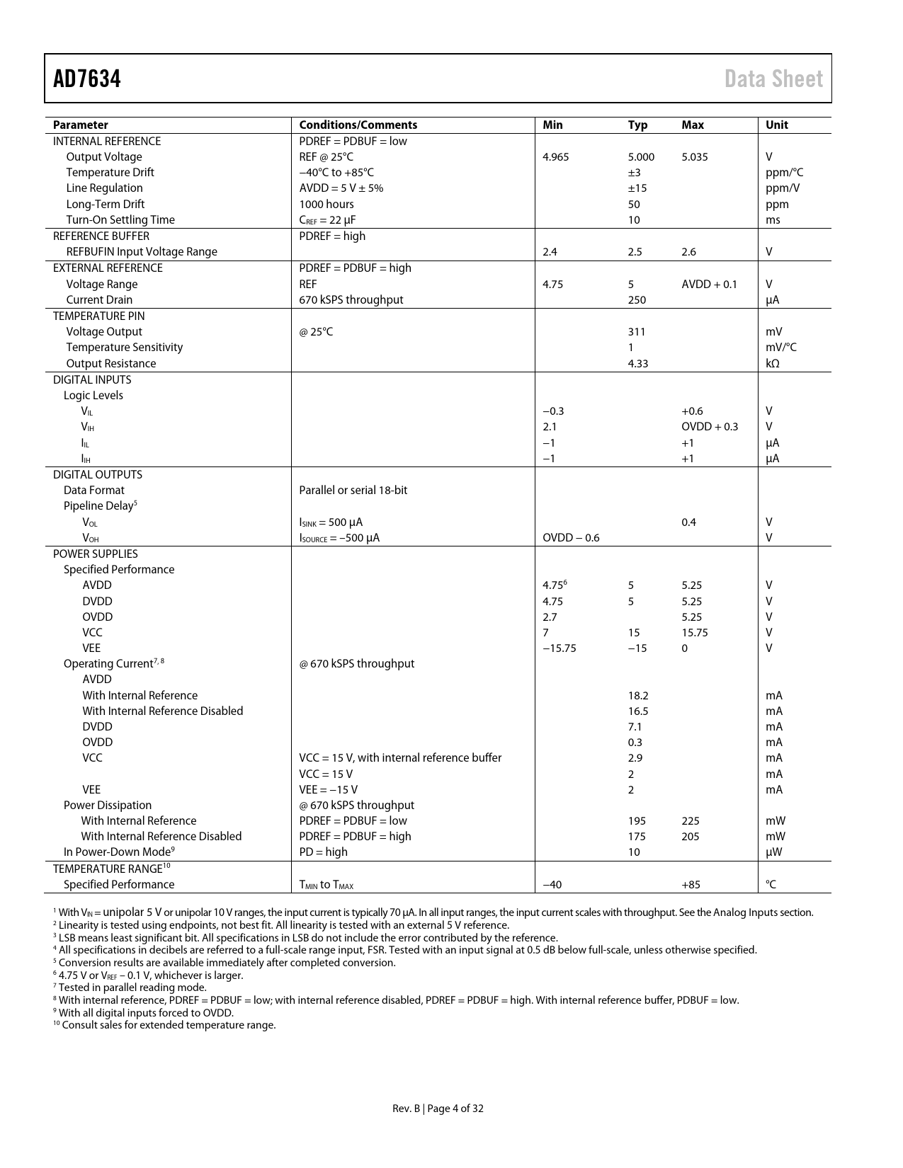 Páginas / Página33 / 5 — AD7634. Data Sheet. Parameter Conditions/Comments. Min. Typ. Max. Unit