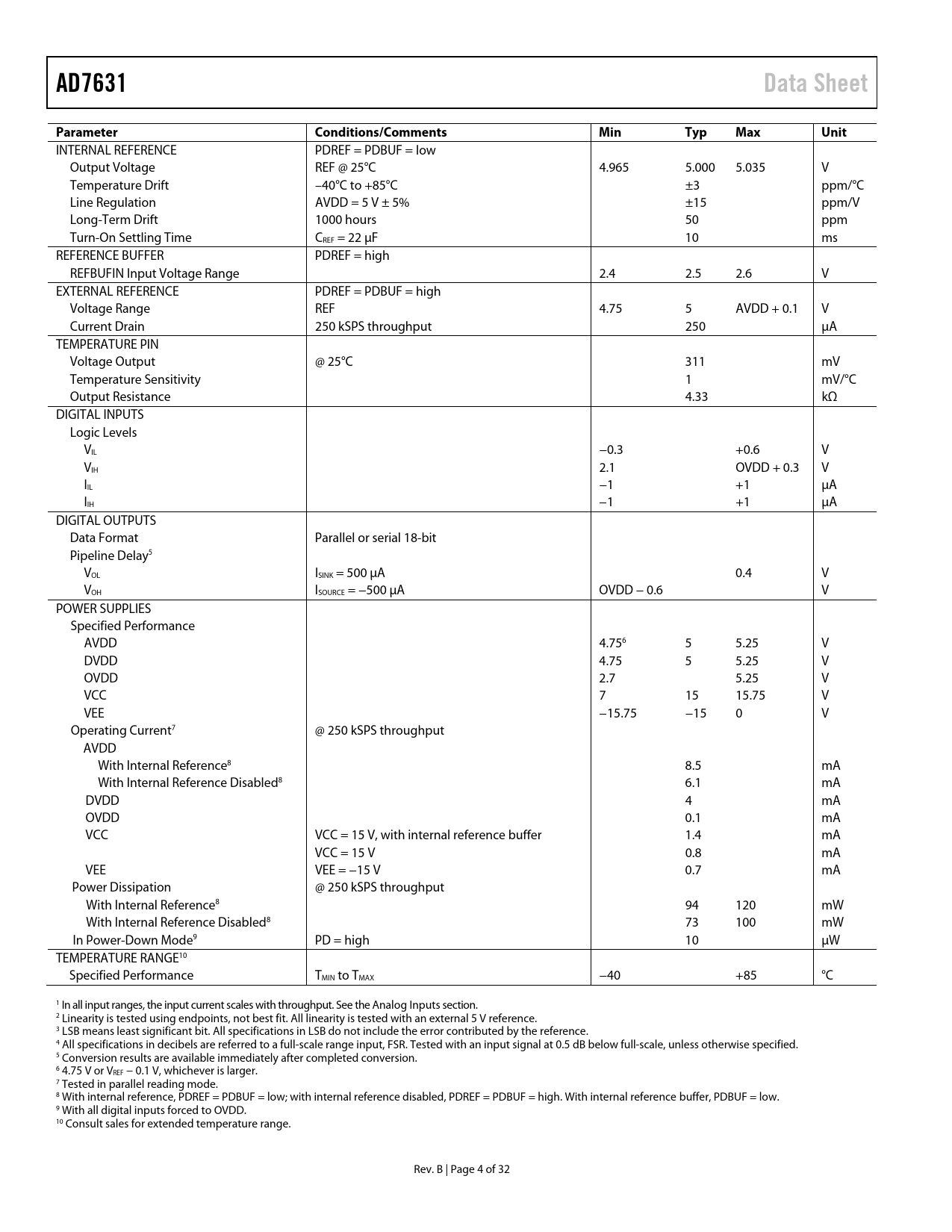 link to page 33 link to page 5 link to page 5 link to page 5 link to page 33 link to page 5 link to page 5 link to page 5 link to page 5 link to page 5 link to page 5 link to page 5 link to page 5 link to page 20 AD7631Data SheetParameter Conditions/CommentsMinTypMaxUnit INTERNAL REFERENCE PDREF = PDBUF = low Output Voltage REF @ 25°C 4.965 5.000 5.035 V Temperature Drift –40°C to +85°C ±3 ppm/°C Line Regulation AVDD = 5 V ± 5% ±15 ppm/V Long-Term Drift 1000 hours 50 ppm Turn-On Settling Time CREF = 22 μF 10 ms REFERENCE BUFFER PDREF = high REFBUFIN Input Voltage Range 2.4 2.5 2.6 V EXTERNAL REFERENCE PDREF = PDBUF = high Voltage Range REF 4.75 5 AVDD + 0.1 V Current Drain 250 kSPS throughput 250 μA TEMPERATURE PIN Voltage Output @ 25°C 311 mV Temperature Sensitivity 1 mV/°C Output Resistance 4.33 kΩ DIGITAL INPUTS Logic Levels VIL −0.3 +0.6 V VIH 2.1 OVDD + 0.3 V IIL −1 +1 μA IIH −1 +1 μA DIGITAL OUTPUTS Data Format Parallel or serial 18-bit Pipeline Delay5 VOL ISINK = 500 μA 0.4 V VOH ISOURCE = −500 μA OVDD − 0.6 V POWER SUPPLIES Specified Performance AVDD 4.756 5 5.25 V DVDD 4.75 5 5.25 V OVDD 2.7 5.25 V VCC 7 15 15.75 V VEE −15.75 −15 0 V Operating Current7 @ 250 kSPS throughput AVDD With Internal Reference8 8.5 mA With Internal Reference Disabled8 6.1 mA DVDD 4 mA OVDD 0.1 mA VCC VCC = 15 V, with internal reference buffer 1.4 mA VCC = 15 V 0.8 mA VEE VEE = −15 V 0.7 mA Power Dissipation @ 250 kSPS throughput With Internal Reference8 94 120 mW With Internal Reference Disabled8 73 100 mW In Power-Down Mode9 PD = high 10 μW TEMPERATURE RANGE10 Specified Performance TMIN to TMAX −40 +85 °C 1 In all input ranges, the input current scales with throughput. See the Analog Inputs section. 2 Linearity is tested using endpoints, not best fit. All linearity is tested with an external 5 V reference. 3 LSB means least significant bit. All specifications in LSB do not include the error contributed by the reference. 4 All specifications in decibels are referred to a full-scale range input, FSR. Tested with an input signal at 0.5 dB below full-scale, unless otherwise specified. 5 Conversion results are available immediately after completed conversion. 6 4.75 V or VREF − 0.1 V, whichever is larger. 7 Tested in parallel reading mode. 8 With internal reference, PDREF = PDBUF = low; with internal reference disabled, PDREF = PDBUF = high. With internal reference buffer, PDBUF = low. 9 With all digital inputs forced to OVDD. 10 Consult sales for extended temperature range. Rev. B | Page 4 of 32 Document Outline FEATURES APPLICATIONS GENERAL DESCRIPTION FUNCTIONAL BLOCK DIAGRAM TABLE OF CONTENTS REVISION HISTORY SPECIFICATIONS TIMING SPECIFICATIONS ABSOLUTE MAXIMUM RATINGS ESD CAUTION PIN CONFIGURATION AND FUNCTION DESCRIPTIONS TYPICAL PERFORMANCE CHARACTERISTICS TERMINOLOGY THEORY OF OPERATION OVERVIEW CONVERTER OPERATION TRANSFER FUNCTIONS TYPICAL CONNECTION DIAGRAM ANALOG INPUTS Input Range Selection Input Structure Single-to-Differential Driver VOLTAGE REFERENCE INPUT/OUTPUT Internal Reference (REF = 5 V)(PDREF = Low, PDBUF = Low) External 2.5 V Reference and Internal Buffer (REF = 5 V)(PDREF = High, PDBUF = Low) External 5 V Reference (PDREF = High, PDBUF = High) Reference Decoupling Temperature Sensor POWER SUPPLIES Core Supplies High Voltage Supplies Digital Output Supply Power Sequencing Power Dissipation vs. Throughput Power Down CONVERSION CONTROL INTERFACES DIGITAL INTERFACE RESET PARALLEL INTERFACE Master Parallel Interface Slave Parallel Interface 18-Bit Interface (Master or Slave) 16-Bit and 8-Bit Interface (Master or Slave) SERIAL INTERFACE Data Interface Serial Configuration Interface MASTER SERIAL INTERFACE Internal Clock (MODE[1:0] = 3, EXT/ = Low) Read During Convert (RDC = High) Read After Convert (RDC = Low, DIVSCLK[1:0] = [0 to 3]) SLAVE SERIAL INTERFACE External Clock (MODE[1:0] = 3, EXT/ = High) External Discontinuous Clock Data Read After Conversion Daisy-Chain Feature External Clock Data Read During Previous Conversion External Clock Data Read After/During Conversion HARDWARE CONFIGURATION SOFTWARE CONFIGURATION MICROPROCESSOR INTERFACING SPI Interface APPLICATION INFORMATION LAYOUT GUIDELINES EVALUATING PERFORMANCE OUTLINE DIMENSIONS ORDERING GUIDE