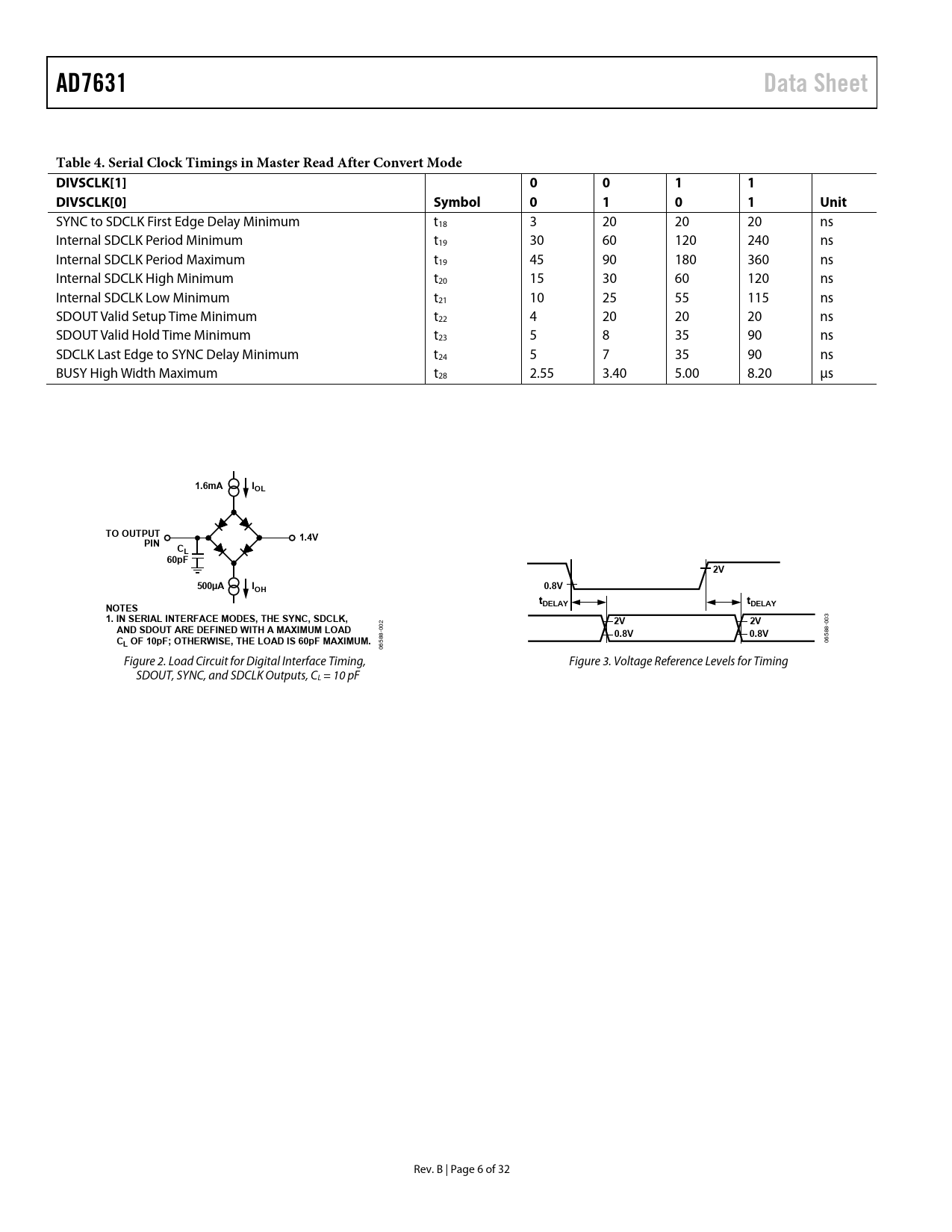 AD7631Data SheetTable 4. Serial Clock Timings in Master Read After Convert Mode DIVSCLK[1]0 0 1 1DIVSCLK[0]Symbol0 1 0 1 Unit SYNC to SDCLK First Edge Delay Minimum t18 3 20 20 20 ns Internal SDCLK Period Minimum t19 30 60 120 240 ns Internal SDCLK Period Maximum t19 45 90 180 360 ns Internal SDCLK High Minimum t20 15 30 60 120 ns Internal SDCLK Low Minimum t21 10 25 55 115 ns SDOUT Valid Setup Time Minimum t22 4 20 20 20 ns SDOUT Valid Hold Time Minimum t23 5 8 35 90 ns SDCLK Last Edge to SYNC Delay Minimum t24 5 7 35 90 ns BUSY High Width Maximum t28 2.55 3.40 5.00 8.20 μs 1.6mAIOLTO OUTPUT1.4VPINCL60pF2V500µAIOH0.8VtNOTESDELAYtDELAY1. IN SERIAL INTERFACE MODES, THE SYNC, SDCLK, 3 2V2V -00 AND SDOUT ARE DEFINED WITH A MAXIMUM LOAD 02 8 -0 0.8V0.8V 58 C 88 L OF 10pF; OTHERWISE, THE LOAD IS 60pF MAXIMUM. 06 65 0 Figure 2. Load Circuit for Digital Interface Timing, Figure 3. Voltage Reference Levels for Timing SDOUT, SYNC, and SDCLK Outputs, CL = 10 pF Rev. B | Page 6 of 32 Document Outline FEATURES APPLICATIONS GENERAL DESCRIPTION FUNCTIONAL BLOCK DIAGRAM TABLE OF CONTENTS REVISION HISTORY SPECIFICATIONS TIMING SPECIFICATIONS ABSOLUTE MAXIMUM RATINGS ESD CAUTION PIN CONFIGURATION AND FUNCTION DESCRIPTIONS TYPICAL PERFORMANCE CHARACTERISTICS TERMINOLOGY THEORY OF OPERATION OVERVIEW CONVERTER OPERATION TRANSFER FUNCTIONS TYPICAL CONNECTION DIAGRAM ANALOG INPUTS Input Range Selection Input Structure Single-to-Differential Driver VOLTAGE REFERENCE INPUT/OUTPUT Internal Reference (REF = 5 V)(PDREF = Low, PDBUF = Low) External 2.5 V Reference and Internal Buffer (REF = 5 V)(PDREF = High, PDBUF = Low) External 5 V Reference (PDREF = High, PDBUF = High) Reference Decoupling Temperature Sensor POWER SUPPLIES Core Supplies High Voltage Supplies Digital Output Supply Power Sequencing Power Dissipation vs. Throughput Power Down CONVERSION CONTROL INTERFACES DIGITAL INTERFACE RESET PARALLEL INTERFACE Master Parallel Interface Slave Parallel Interface 18-Bit Interface (Master or Slave) 16-Bit and 8-Bit Interface (Master or Slave) SERIAL INTERFACE Data Interface Serial Configuration Interface MASTER SERIAL INTERFACE Internal Clock (MODE[1:0] = 3, EXT/ = Low) Read During Convert (RDC = High) Read After Convert (RDC = Low, DIVSCLK[1:0] = [0 to 3]) SLAVE SERIAL INTERFACE External Clock (MODE[1:0] = 3, EXT/ = High) External Discontinuous Clock Data Read After Conversion Daisy-Chain Feature External Clock Data Read During Previous Conversion External Clock Data Read After/During Conversion HARDWARE CONFIGURATION SOFTWARE CONFIGURATION MICROPROCESSOR INTERFACING SPI Interface APPLICATION INFORMATION LAYOUT GUIDELINES EVALUATING PERFORMANCE OUTLINE DIMENSIONS ORDERING GUIDE