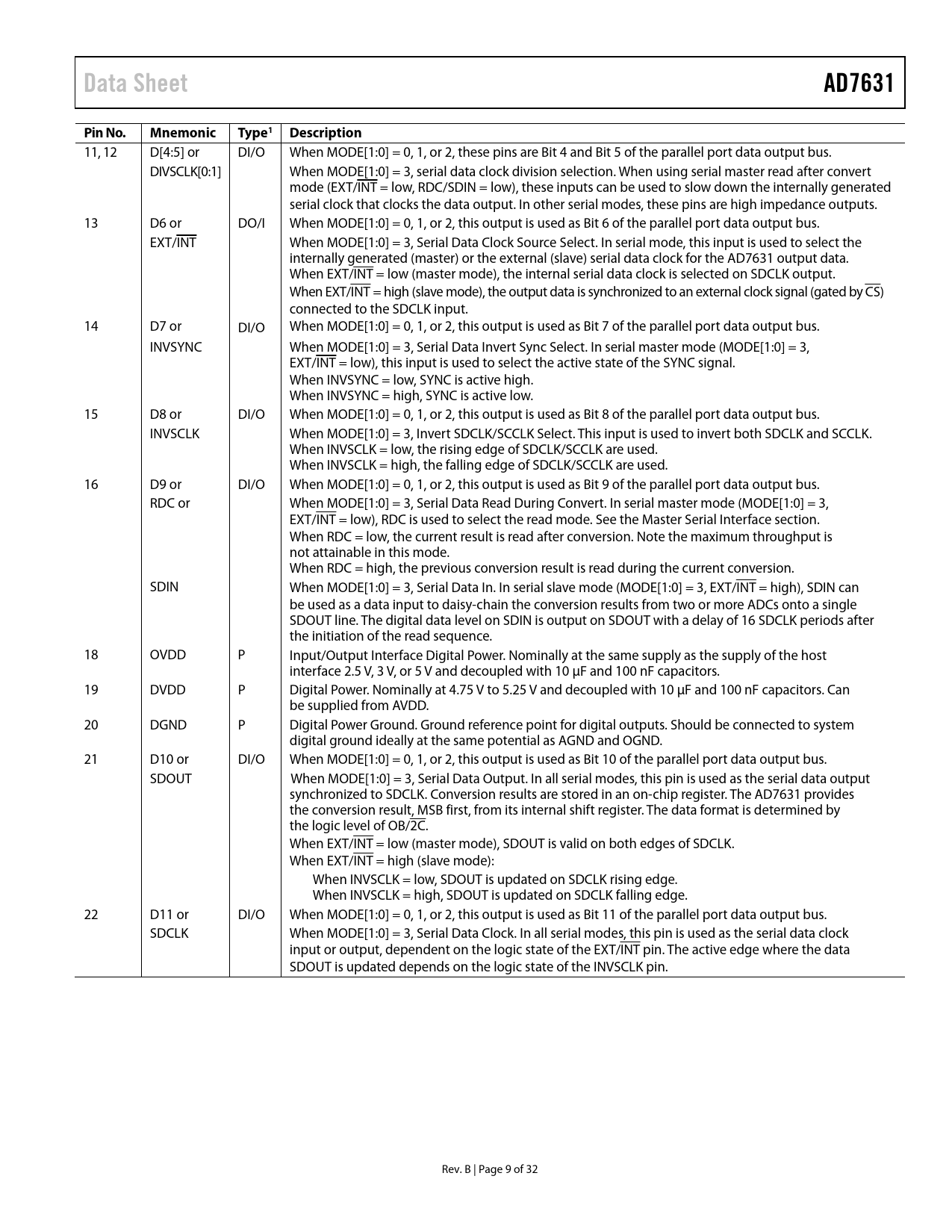 link to page 26 link to page 12 Data SheetAD7631Pin No.MnemonicType1 Description 11, 12 D[4:5] or DI/O When MODE[1:0] = 0, 1, or 2, these pins are Bit 4 and Bit 5 of the parallel port data output bus. DIVSCLK[0:1] When MODE[1:0] = 3, serial data clock division selection. When using serial master read after convert mode (EXT/INT = low, RDC/SDIN = low), these inputs can be used to slow down the internally generated serial clock that clocks the data output. In other serial modes, these pins are high impedance outputs. 13 D6 or DO/I When MODE[1:0] = 0, 1, or 2, this output is used as Bit 6 of the parallel port data output bus. EXT/INT When MODE[1:0] = 3, Serial Data Clock Source Select. In serial mode, this input is used to select the internally generated (master) or the external (slave) serial data clock for the AD7631 output data. When EXT/INT = low (master mode), the internal serial data clock is selected on SDCLK output. When EXT/INT = high (slave mode), the output data is synchronized to an external clock signal (gated by CS) connected to the SDCLK input. 14 D7 or DI/O When MODE[1:0] = 0, 1, or 2, this output is used as Bit 7 of the parallel port data output bus. INVSYNC When MODE[1:0] = 3, Serial Data Invert Sync Select. In serial master mode (MODE[1:0] = 3, EXT/INT = low), this input is used to select the active state of the SYNC signal. When INVSYNC = low, SYNC is active high. When INVSYNC = high, SYNC is active low. 15 D8 or DI/O When MODE[1:0] = 0, 1, or 2, this output is used as Bit 8 of the parallel port data output bus. INVSCLK When MODE[1:0] = 3, Invert SDCLK/SCCLK Select. This input is used to invert both SDCLK and SCCLK. When INVSCLK = low, the rising edge of SDCLK/SCCLK are used. When INVSCLK = high, the falling edge of SDCLK/SCCLK are used. 16 D9 or DI/O When MODE[1:0] = 0, 1, or 2, this output is used as Bit 9 of the parallel port data output bus. RDC or When MODE[1:0] = 3, Serial Data Read During Convert. In serial master mode (MODE[1:0] = 3, EXT/INT = low), RDC is used to select the read mode. See the Master Serial Interface section. When RDC = low, the current result is read after conversion. Note the maximum throughput is not attainable in this mode. When RDC = high, the previous conversion result is read during the current conversion. SDIN When MODE[1:0] = 3, Serial Data In. In serial slave mode (MODE[1:0] = 3, EXT/INT = high), SDIN can be used as a data input to daisy-chain the conversion results from two or more ADCs onto a single SDOUT line. The digital data level on SDIN is output on SDOUT with a delay of 16 SDCLK periods after the initiation of the read sequence. 18 OVDD P Input/Output Interface Digital Power. Nominally at the same supply as the supply of the host interface 2.5 V, 3 V, or 5 V and decoupled with 10 μF and 100 nF capacitors. 19 DVDD P Digital Power. Nominally at 4.75 V to 5.25 V and decoupled with 10 μF and 100 nF capacitors. Can be supplied from AVDD. 20 DGND P Digital Power Ground. Ground reference point for digital outputs. Should be connected to system digital ground ideally at the same potential as AGND and OGND. 21 D10 or DI/O When MODE[1:0] = 0, 1, or 2, this output is used as Bit 10 of the parallel port data output bus. SDOUT When MODE[1:0] = 3, Serial Data Output. In all serial modes, this pin is used as the serial data output synchronized to SDCLK. Conversion results are stored in an on-chip register. The AD7631 provides the conversion result, MSB first, from its internal shift register. The data format is determined by the logic level of OB/2C. When EXT/INT = low (master mode), SDOUT is valid on both edges of SDCLK. When EXT/INT = high (slave mode): When INVSCLK = low, SDOUT is updated on SDCLK rising edge. When INVSCLK = high, SDOUT is updated on SDCLK falling edge. 22 D11 or DI/O When MODE[1:0] = 0, 1, or 2, this output is used as Bit 11 of the parallel port data output bus. SDCLK When MODE[1:0] = 3, Serial Data Clock. In all serial modes, this pin is used as the serial data clock input or output, dependent on the logic state of the EXT/INT pin. The active edge where the data SDOUT is updated depends on the logic state of the INVSCLK pin. Rev. B | Page 9 of 32 Document Outline FEATURES APPLICATIONS GENERAL DESCRIPTION FUNCTIONAL BLOCK DIAGRAM TABLE OF CONTENTS REVISION HISTORY SPECIFICATIONS TIMING SPECIFICATIONS ABSOLUTE MAXIMUM RATINGS ESD CAUTION PIN CONFIGURATION AND FUNCTION DESCRIPTIONS TYPICAL PERFORMANCE CHARACTERISTICS TERMINOLOGY THEORY OF OPERATION OVERVIEW CONVERTER OPERATION TRANSFER FUNCTIONS TYPICAL CONNECTION DIAGRAM ANALOG INPUTS Input Range Selection Input Structure Single-to-Differential Driver VOLTAGE REFERENCE INPUT/OUTPUT Internal Reference (REF = 5 V)(PDREF = Low, PDBUF = Low) External 2.5 V Reference and Internal Buffer (REF = 5 V)(PDREF = High, PDBUF = Low) External 5 V Reference (PDREF = High, PDBUF = High) Reference Decoupling Temperature Sensor POWER SUPPLIES Core Supplies High Voltage Supplies Digital Output Supply Power Sequencing Power Dissipation vs. Throughput Power Down CONVERSION CONTROL INTERFACES DIGITAL INTERFACE RESET PARALLEL INTERFACE Master Parallel Interface Slave Parallel Interface 18-Bit Interface (Master or Slave) 16-Bit and 8-Bit Interface (Master or Slave) SERIAL INTERFACE Data Interface Serial Configuration Interface MASTER SERIAL INTERFACE Internal Clock (MODE[1:0] = 3, EXT/ = Low) Read During Convert (RDC = High) Read After Convert (RDC = Low, DIVSCLK[1:0] = [0 to 3]) SLAVE SERIAL INTERFACE External Clock (MODE[1:0] = 3, EXT/ = High) External Discontinuous Clock Data Read After Conversion Daisy-Chain Feature External Clock Data Read During Previous Conversion External Clock Data Read After/During Conversion HARDWARE CONFIGURATION SOFTWARE CONFIGURATION MICROPROCESSOR INTERFACING SPI Interface APPLICATION INFORMATION LAYOUT GUIDELINES EVALUATING PERFORMANCE OUTLINE DIMENSIONS ORDERING GUIDE