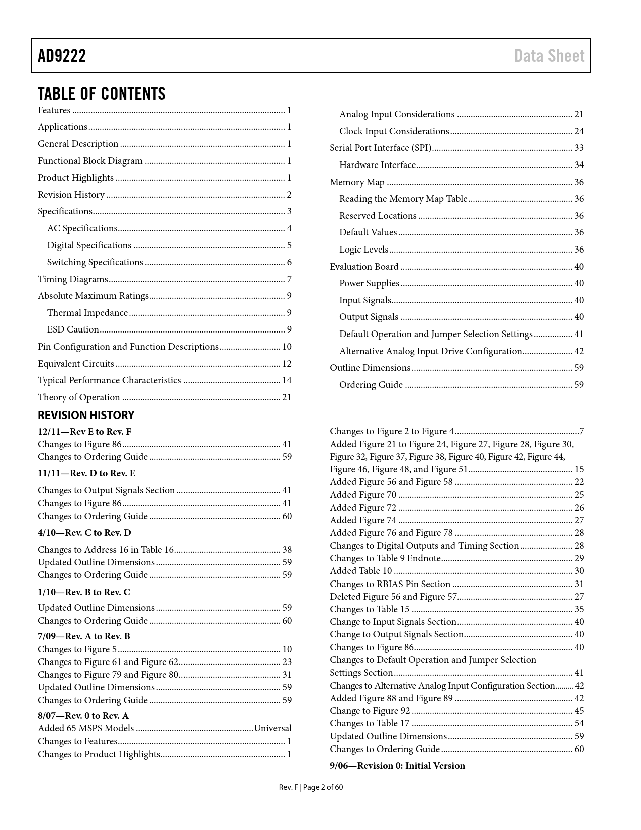 link to page 1 link to page 1 link to page 1 link to page 1 link to page 1 link to page 3 link to page 4 link to page 5 link to page 6 link to page 7 link to page 8 link to page 10 link to page 10 link to page 10 link to page 11 link to page 13 link to page 15 link to page 22 link to page 22 link to page 25 link to page 34 link to page 35 link to page 37 link to page 37 link to page 37 link to page 37 link to page 37 link to page 41 link to page 41 link to page 41 link to page 41 link to page 42 link to page 43 link to page 60 link to page 60 AD9222Data SheetTABLE OF CONTENTS Features .. 1 Analog Input Considerations ... 21 Applications ... 1 Clock Input Considerations .. 24 General Description ... 1 Serial Port Interface (SPI) .. 33 Functional Block Diagram .. 1 Hardware Interface ... 34 Product Highlights ... 1 Memory Map .. 36 Revision History ... 2 Reading the Memory Map Table .. 36 Specifications ... 3 Reserved Locations .. 36 AC Specifications .. 4 Default Values ... 36 Digital Specifications ... 5 Logic Levels ... 36 Switching Specifications .. 6 Evaluation Board .. 40 Timing Diagrams .. 7 Power Supplies .. 40 Absolute Maximum Ratings .. 9 Input Signals.. 40 Thermal Impedance ... 9 Output Signals .. 40 ESD Caution .. 9 Default Operation and Jumper Selection Settings ... 41 Pin Configuration and Function Descriptions ... 10 Alternative Analog Input Drive Configuration.. 42 Equivalent Circuits ... 12 Outline Dimensions ... 59 Typical Performance Characteristics ... 14 Ordering Guide .. 59 Theory of Operation .. 21 REVISION HISTORY 12/11—Rev E to Rev. F Changes to Figure 2 to Figure 4 ... 7 Changes to Figure 86 .. 41 Added Figure 21 to Figure 24, Figure 27, Figure 28, Figure 30, Changes to Ordering Guide .. 59 Figure 32, Figure 37, Figure 38, Figure 40, Figure 42, Figure 44, 11/11—Rev. D to Rev. E Figure 46, Figure 48, and Figure 51 .. 15 Added Figure 56 and Figure 58 .. 22 Changes to Output Signals Section .. 41 Added Figure 70 ... 25 Changes to Figure 86 .. 41 Added Figure 72 ... 26 Changes to Ordering Guide .. 60 Added Figure 74 ... 27 4/10—Rev. C to Rev. D Added Figure 76 and Figure 78 .. 28 Changes to Address 16 in Table 16 ... 38 Changes to Digital Outputs and Timing Section ... 28 Updated Outline Dimensions ... 59 Changes to Table 9 Endnote .. 29 Changes to Ordering Guide .. 59 Added Table 10 ... 30 Changes to RBIAS Pin Section ... 31 1/10—Rev. B to Rev. C Deleted Figure 56 and Figure 57... 27 Updated Outline Dimensions ... 59 Changes to Table 15 ... 35 Changes to Ordering Guide .. 60 Change to Input Signals Section ... 40 7/09—Rev. A to Rev. B Change to Output Signals Section.. 40 Changes to Figure 5 .. 10 Changes to Figure 86 .. 40 Changes to Figure 61 and Figure 62 ... 23 Changes to Default Operation and Jumper Selection Changes to Figure 79 and Figure 80 ... 31 Settings Section ... 41 Updated Outline Dimensions ... 59 Changes to Alternative Analog Input Configuration Section . ... ... 42 Changes to Ordering Guide .. 59 Added Figure 88 and Figure 89 .. 42 8/07—Rev. 0 to Rev. A Change to Figure 92 ... 45 Added 65 MSPS Models .. Universal Changes to Table 17 ... 54 Changes to Features .. 1 Updated Outline Dimensions ... 59 Changes to Product Highlights ... 1 Changes to Ordering Guide .. 60 9/06—Revision 0: Initial Version Rev. F | Page 2 of 60 Document Outline Features Applications General Description Functional Block Diagram Product Highlights Table of Contents Revision History Specifications AC Specifications Digital Specifications Switching Specifications Timing Diagrams Absolute Maximum Ratings Thermal Impedance ESD Caution Pin Configuration and Function Descriptions Equivalent Circuits Typical Performance Characteristics Theory of Operation Analog Input Considerations Differential Input Configurations Single-Ended Input Configuration Clock Input Considerations Clock Duty Cycle Considerations Clock Jitter Considerations Power Dissipation and Power-Down Mode Digital Outputs and Timing SDIO/ODM Pin SCLK/DTP Pin CSB Pin RBIAS Pin Voltage Reference Internal Reference Operation External Reference Operation Serial Port Interface (SPI) Hardware Interface Memory Map Reading the Memory Map Table Reserved Locations Default Values Logic Levels Power and Ground Recommendations Exposed Paddle Thermal Heat Slug Recommendations Evaluation Board Power Supplies Input Signals Output Signals Default Operation and Jumper Selection Settings Alternative Analog Input Drive Configuration Outline Dimensions Ordering Guide