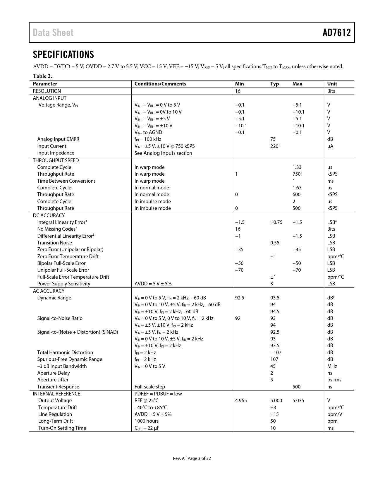 Data Sheet AD7612 SPECIFICATIONS Table 2 Parameter Conditions/Comments Min Typ Max Unit